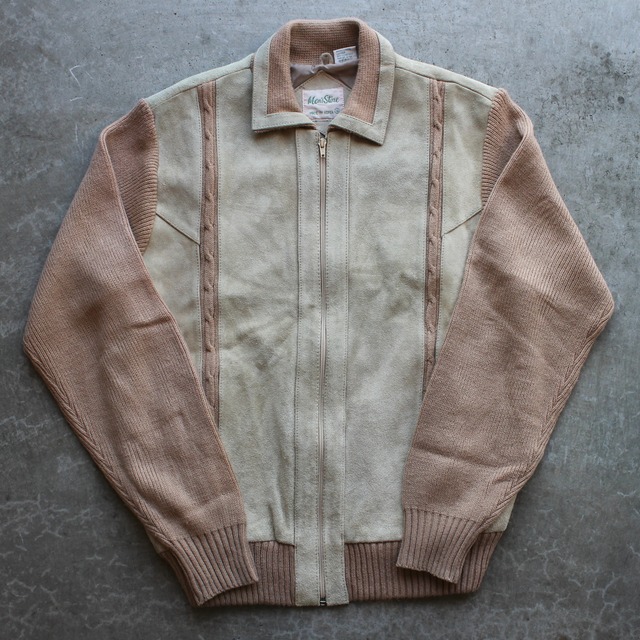 着丈前66 後62.5 肩幅46.5 身幅57 袖丈68.5 80年代頃、SEARS系ラインにも採用されていたスエード×ニット切り替えブルゾン。 フロントは柔らかなスエード、袖とパネル部分はアクリルニットで構成された、当時らしいハイブリッドな一枚です。 ワントーンでまとめられており上品な雰囲気。 アメカジとユーロのニュアンスの中間のようなユニークな存在感◎