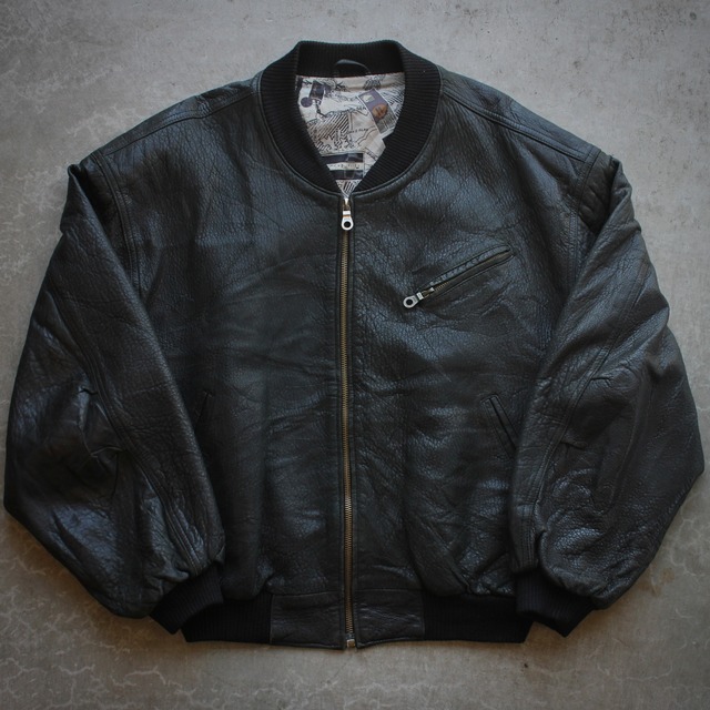 着丈前66後63.5 肩幅64 身幅68 袖丈59.5 80〜90年代頃のヨーロッパで仕立てられたレザーボンバージャケット。 重厚なシボが美しい上質なレザーを贅沢に使用し、フロントには当時のハイブランドでも多く採用されていたriri SWISSジッパーを搭載した仕様。 短めの着丈に対してアームはゆったりとボリュームがあり、 リブ使いの襟、袖、裾が全体をフライトジャケットらしい丸みのあるシルエットにまとめています。 80〜90sのユーロモード期を象徴するような、存在感と着やすさのバランスがとれたデザインです。 内側の総柄裏地は、航空券や地図をモチーフにした珍しいパターンでユーロらしい遊び心を感じます。 ほぼ見かけない希少なディテールで、1点物としての魅力を強く感じられます。