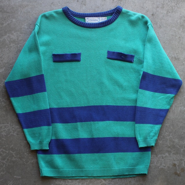 着丈60.5 肩幅61 身幅59 袖丈57.5 グリーン、ネイビー、パープルのカラーブラックデザイン。 中厚のコットンニットで肌触りや保温性も◎ 肩幅しっかりあり緩めのシルエット。 男女問わず色々なスタイリングに活きる万能なグッドレギュラー