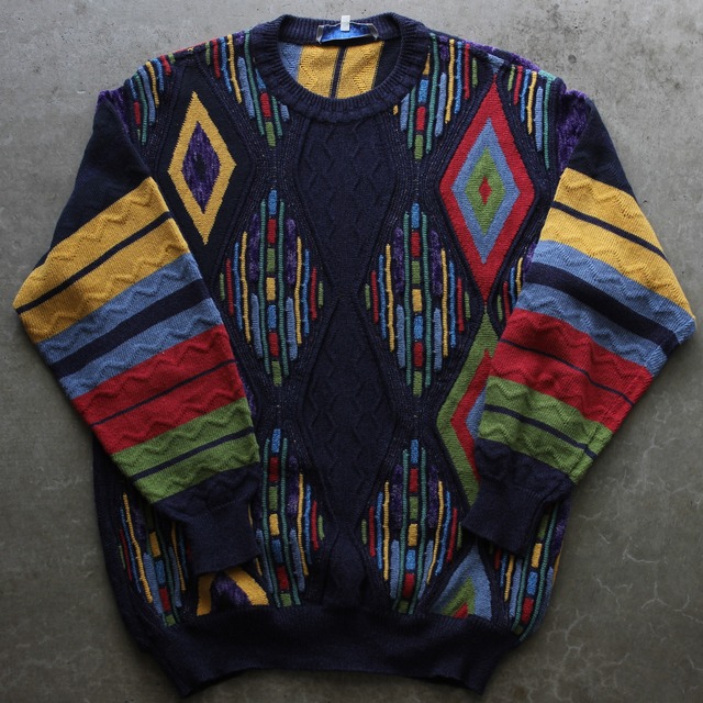 着丈72 肩幅49 身幅55 袖丈57.5 made in Italy ネイビーのボディに、立体的な織り柄、多色使いの幾何学模様を組み合わせた クージー系の表情豊かなデザインが魅力の一枚。 菱形パネルやカラフルなブロック状の織りが立体的に浮き上がり、 袖にはストライプの配色パターンを採用した贅沢な編み仕様。 イタリア製らしい柔らかな着心地としっかりとした生地感が◎ 馴染みやすい褪せた風合いなので丁度いい頃合い。 シンプルに合わせたい。