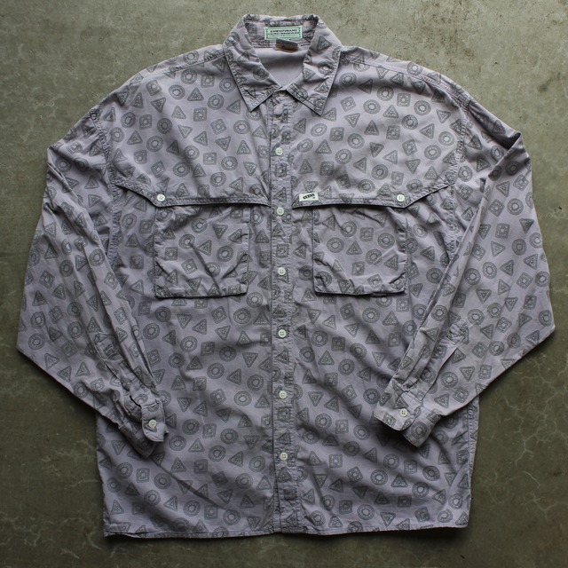 着丈72 肩幅58 身幅60 袖丈54.5 幾何学モチーフの総柄とフィッシングシャツ構造が融合した、Georges Marciano期のレアピース。 ポケットもしっかり使えるのが◎ 軽やかなコットンシェルに通気構造を備えた実用性の高い仕様。グレイッシュパープルのトーンが落ち着きと存在感を放ちます。 GUESS初期〜中期の空気を感じさせる一着です。 サイズもしっかりと◎