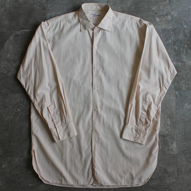 バックヨークギャザーや裾のマチつきなどディテールが光る一枚。 生成りっぽい色味やポプリン特有の緻密さや光沢感も◎ 身幅や着丈もしっかりあるのでガバッと着られるフレンチグランパ的なニュアンスも感じます。 着丈前82後83.5 肩幅47 身幅61.5 袖丈59