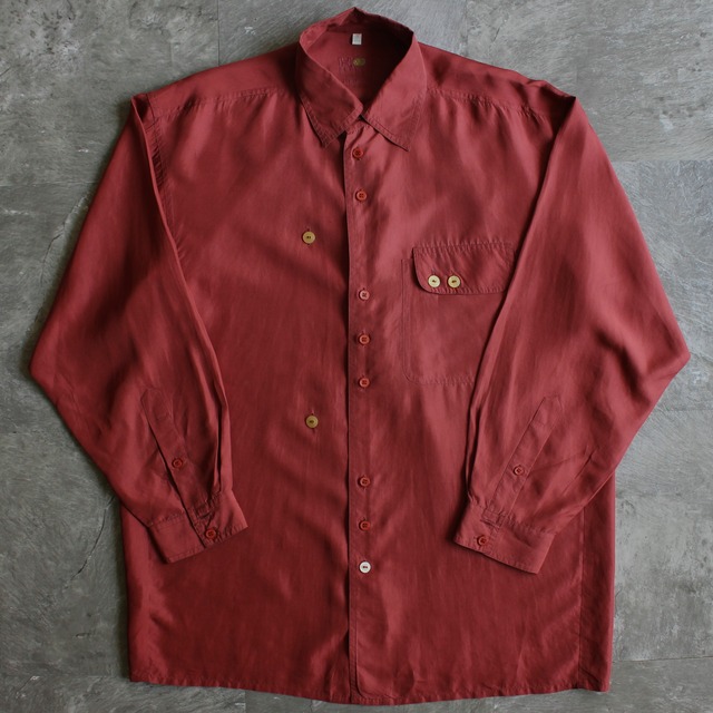 styled in France 80年代ごろフランスインナーブランドHOMの派生ライン。(HOM CHEMISES) シルク100%の好素材、 シンプルながら遊び心のあるボタン配置にフランスらしいセンスを感じます。 サイズ感にゆとりもあり、何よりくすみがかったバーガンディカラーが良いです。 着丈76 肩幅52.5 身幅60.5 袖丈55.5