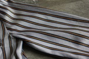 上品でドレープ感ある一枚です。かなり薄いサックスのようなグレーのような下地に、絶妙なイエローから為されるストライプ、ぱっと見でわかるボックスシルエットが◎