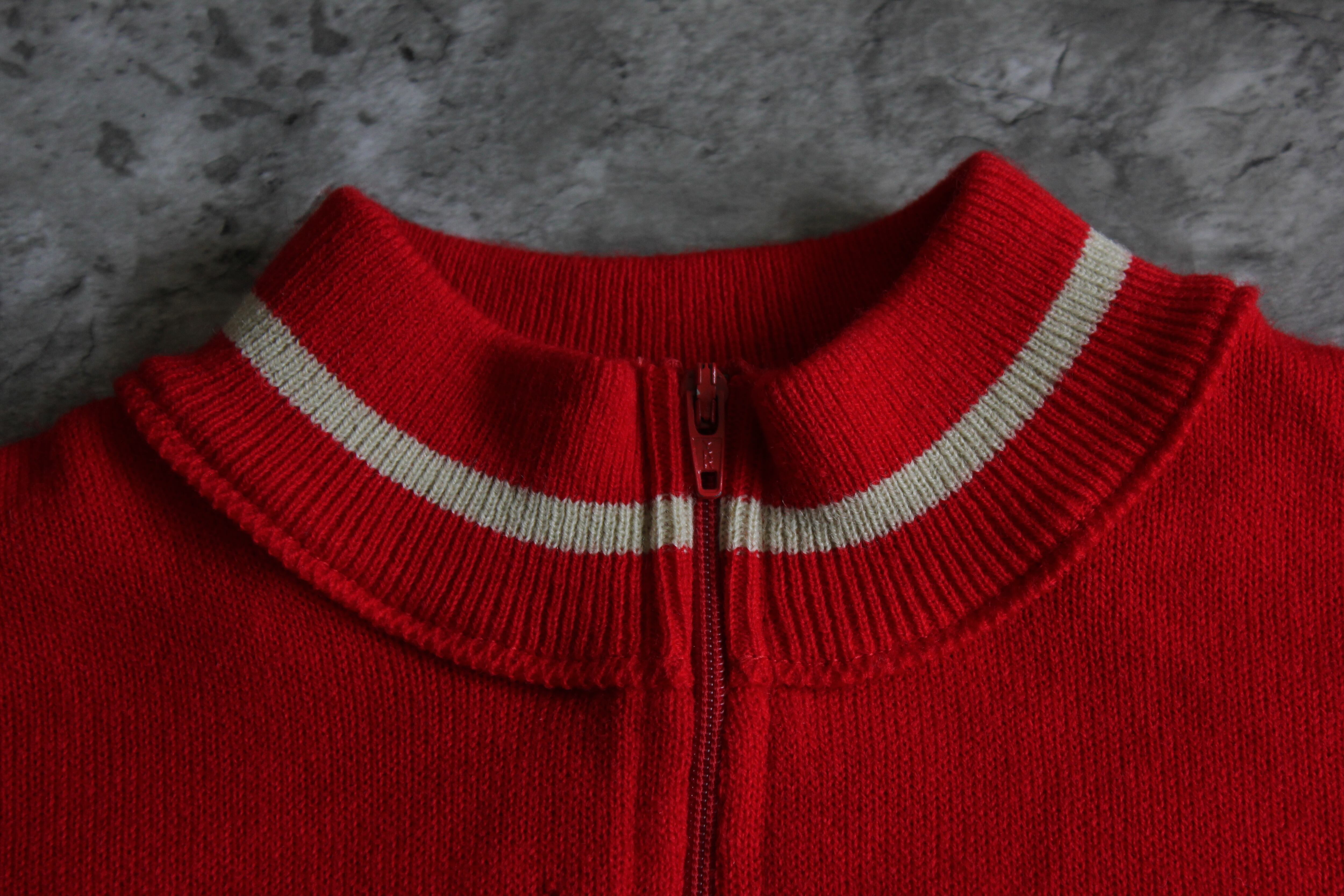 アクリル素材、ハーフジップ・背面3ポケット付きというクラシックな仕様を備えた一着です。
