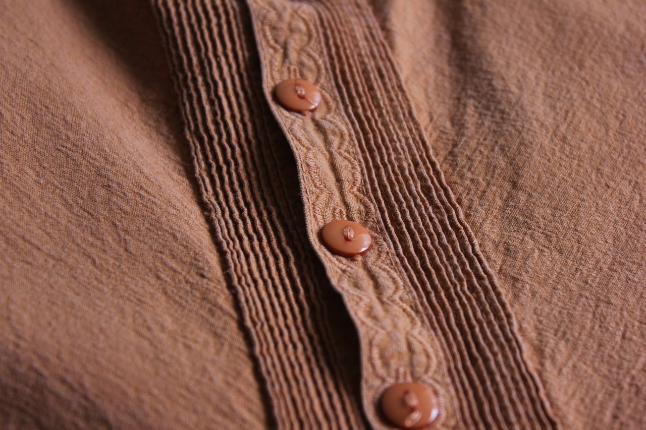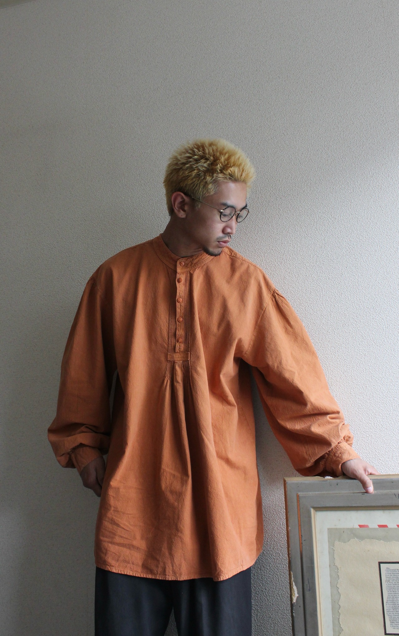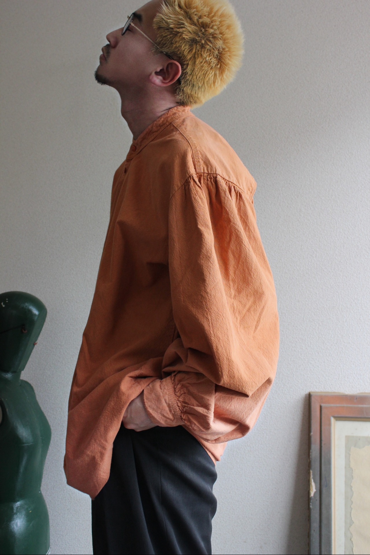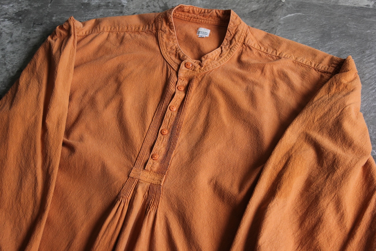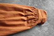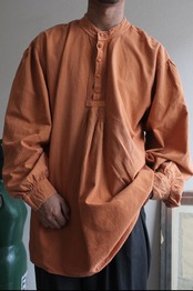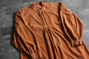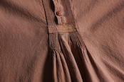 くったりと柔らかく風合いのあるテラコッタカラーの生地に、前立てにはピンタックと刺繍入りのクラフト感あるディテールが施されています。