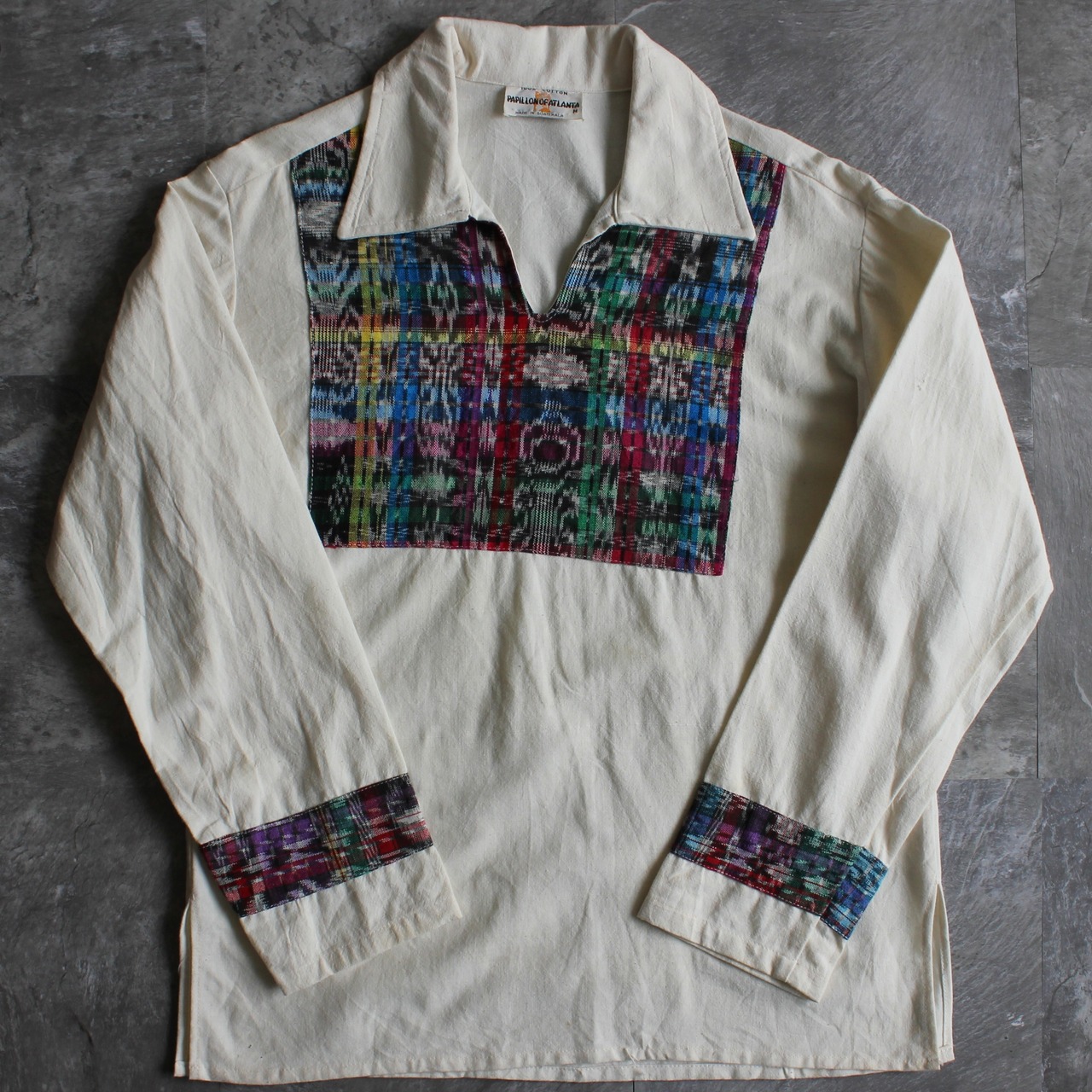 1970年代頃のフォークカルチャーを背景に、グアテマラ製の伝統的な手織り布を使用して仕立てられたコットンプルオーバーシャツ。