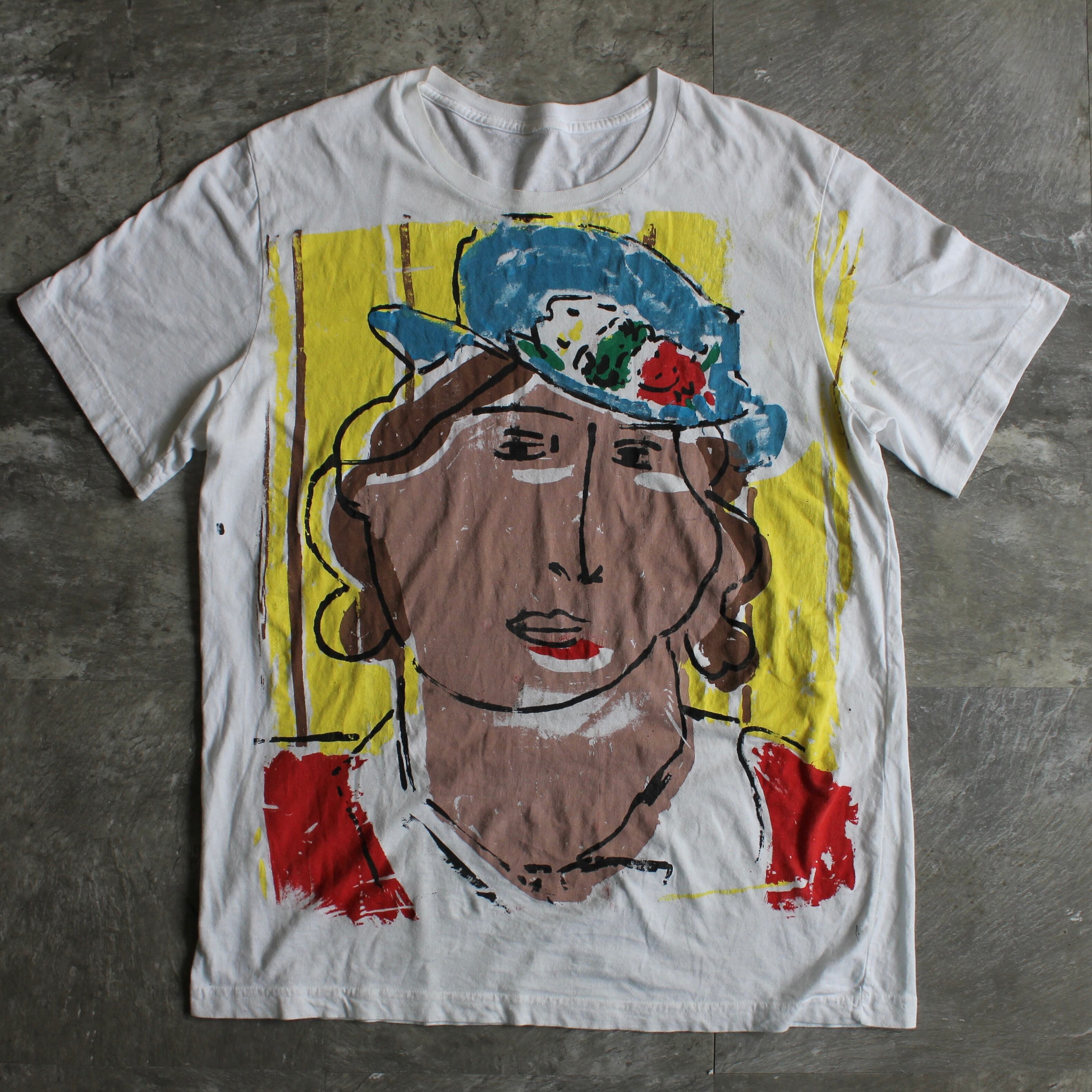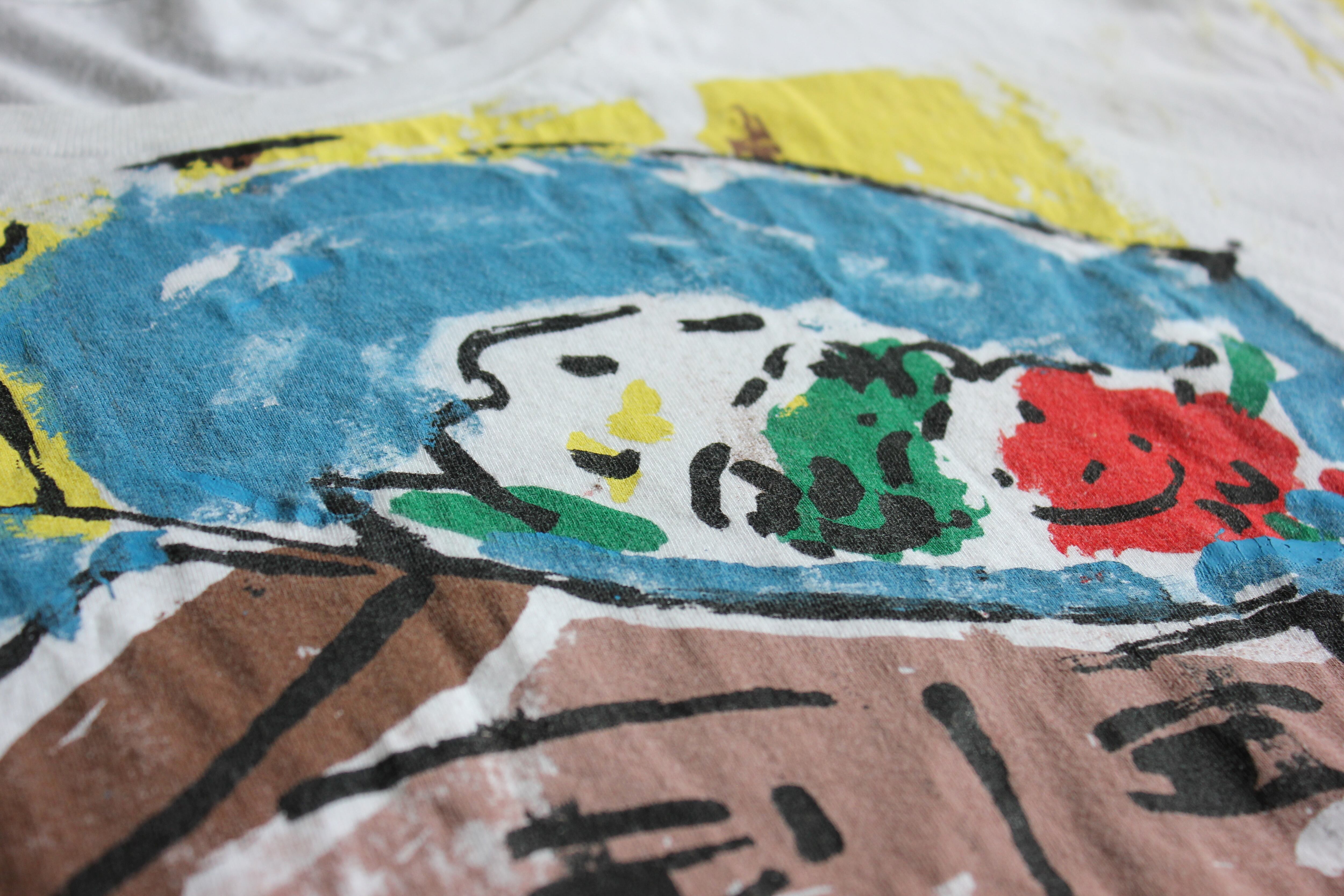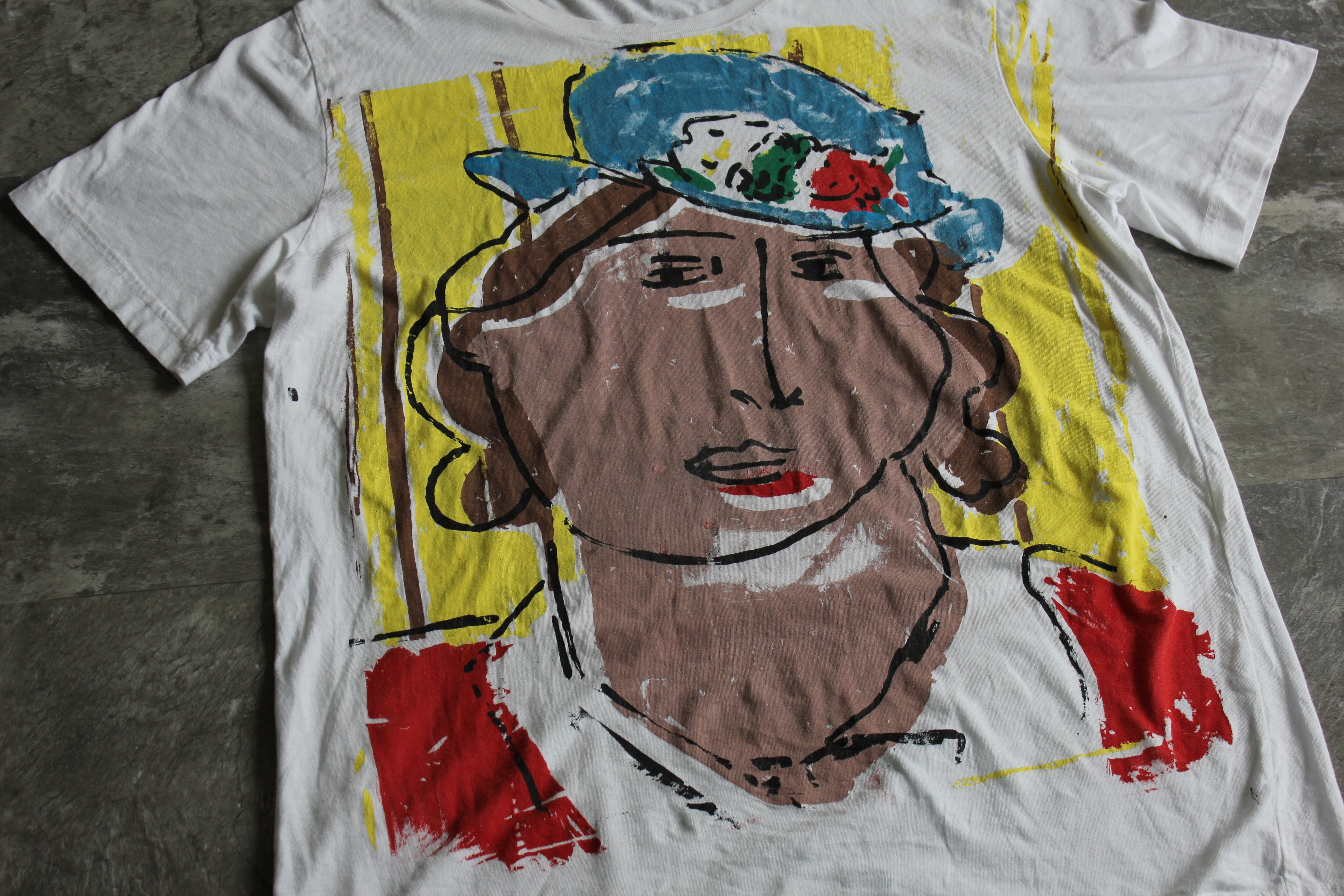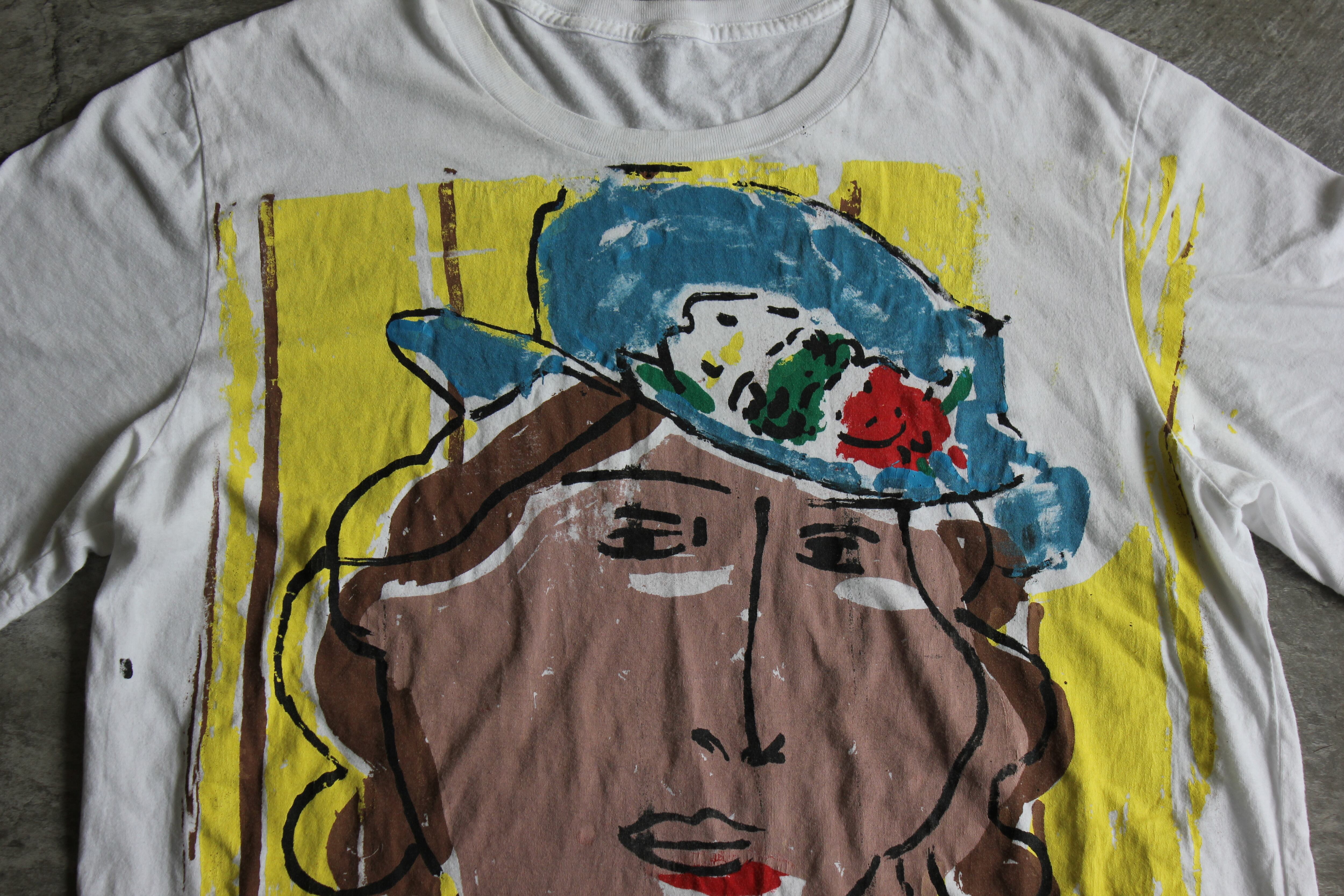 ピカソのような大胆な人物表現と、バスキアのような自由奔放な筆使いを思わせます。まさに着られるアートとして一点モノの存在感を放ちます。