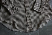 ブラウン系のチェックパターンに、パール調のスナップボタン、特徴的なヨークデザインが施された一枚。襟の広がりやフロントポケットのフラップディテールなど、70sらしい空気感が詰まっています。