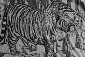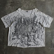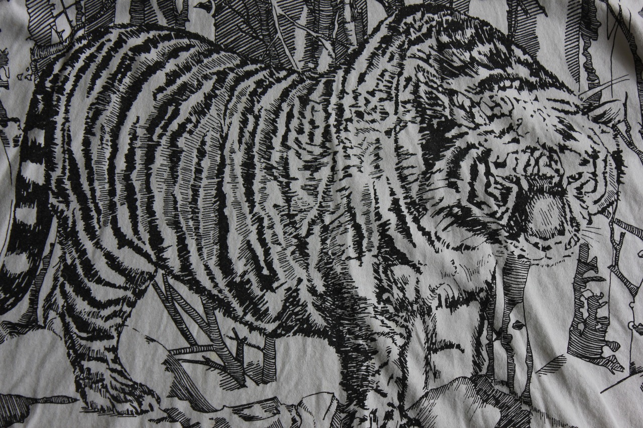 前後にまたがる全面プリント仕様で、リアルなタッチのシベリアンタイガーが冬の森を歩む姿を描いた、アート性の高い一着です。