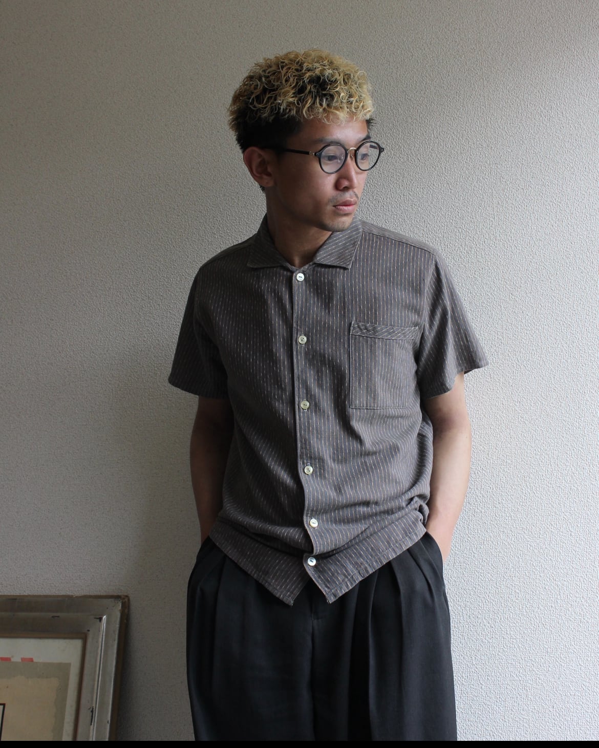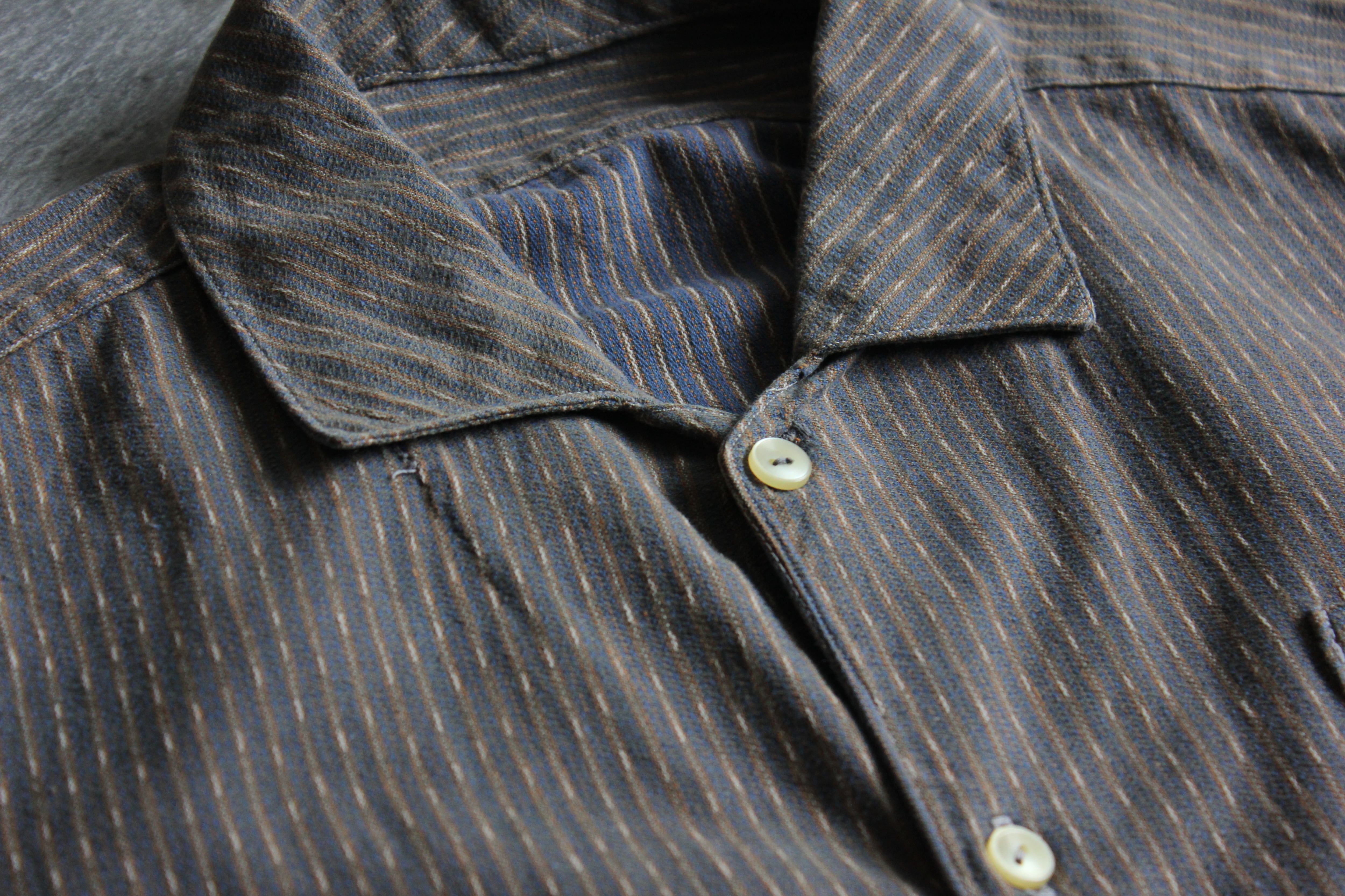 グレー地にブラウンと生成りの細かなストライプが施されたフレンチやジャーマンワークウェアを思わせる無骨で落ち着いた配色が特徴的な一枚。