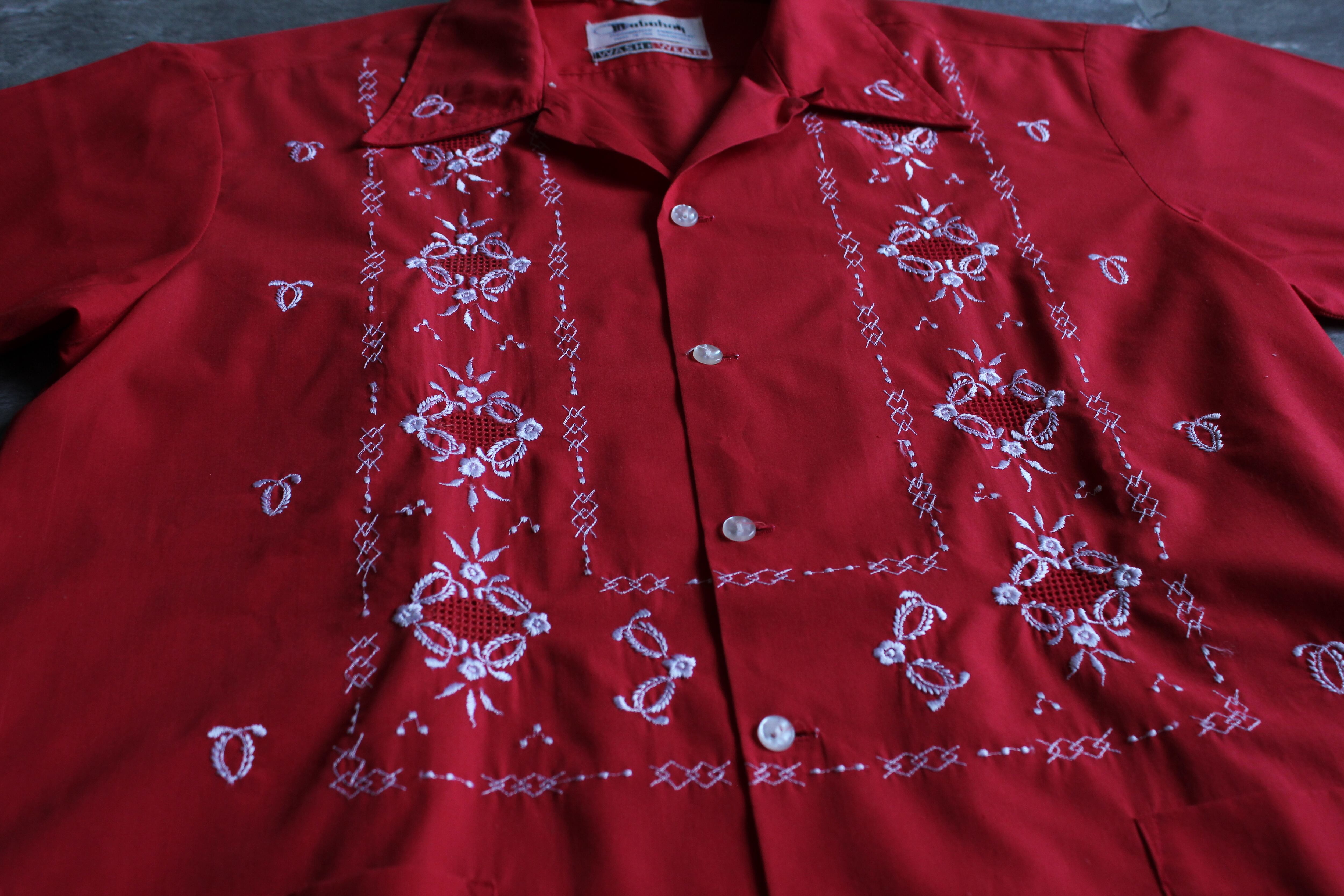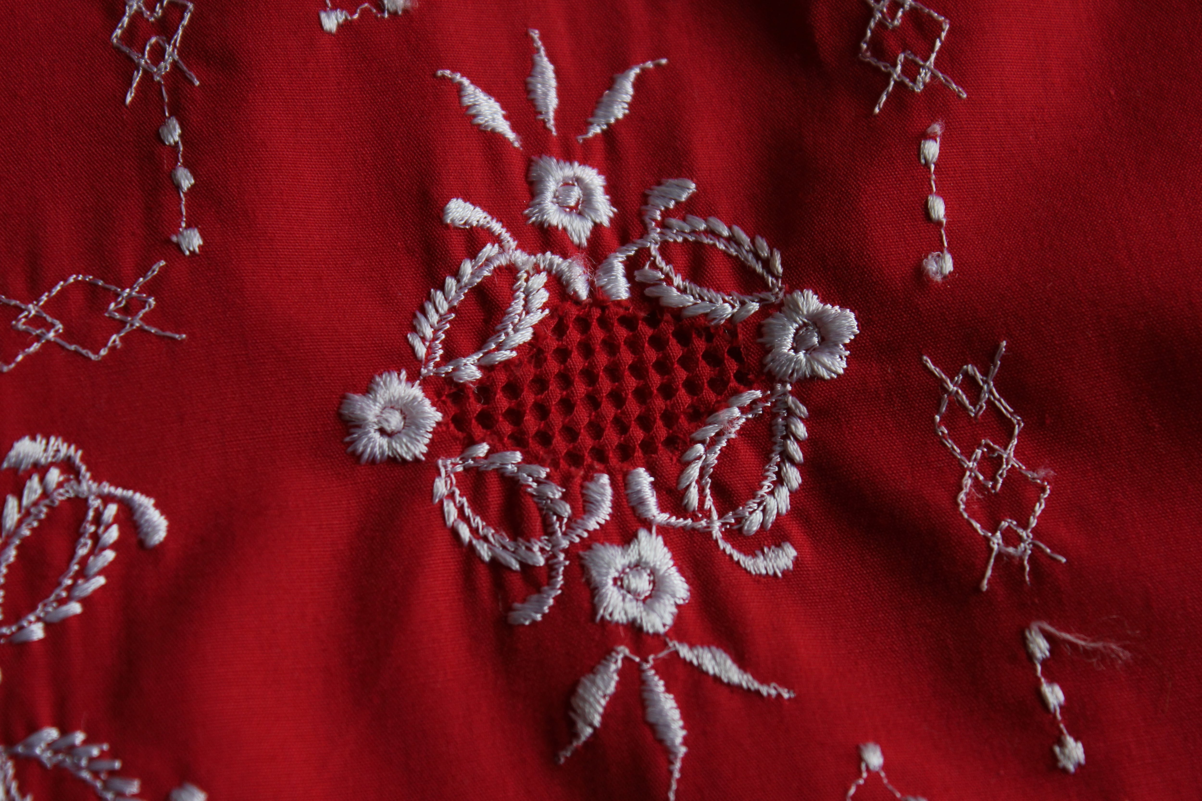 鮮やかな赤地に、透かし刺繍を含む繊細な白のフローラル刺繍が施された存在感とこだわりある一枚。