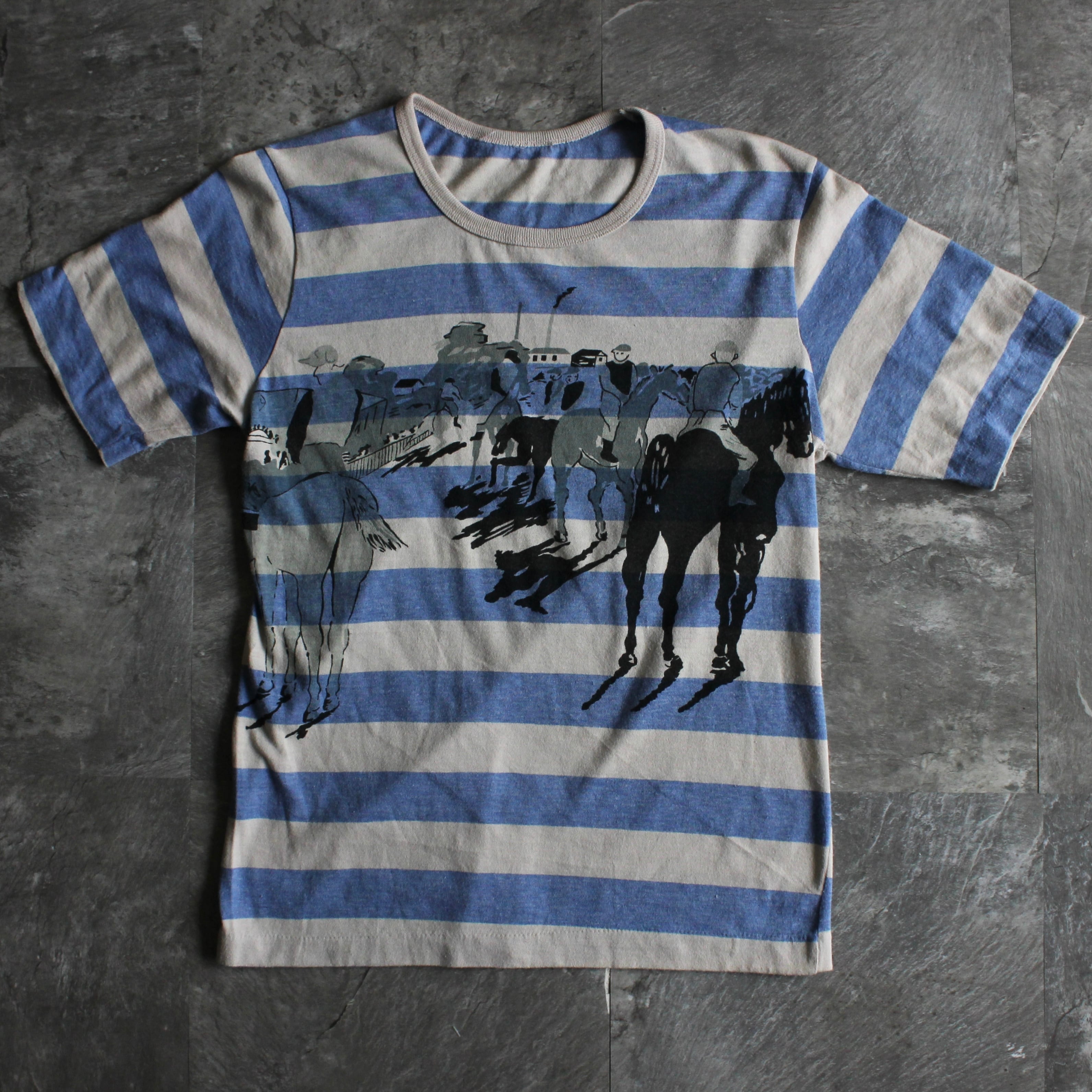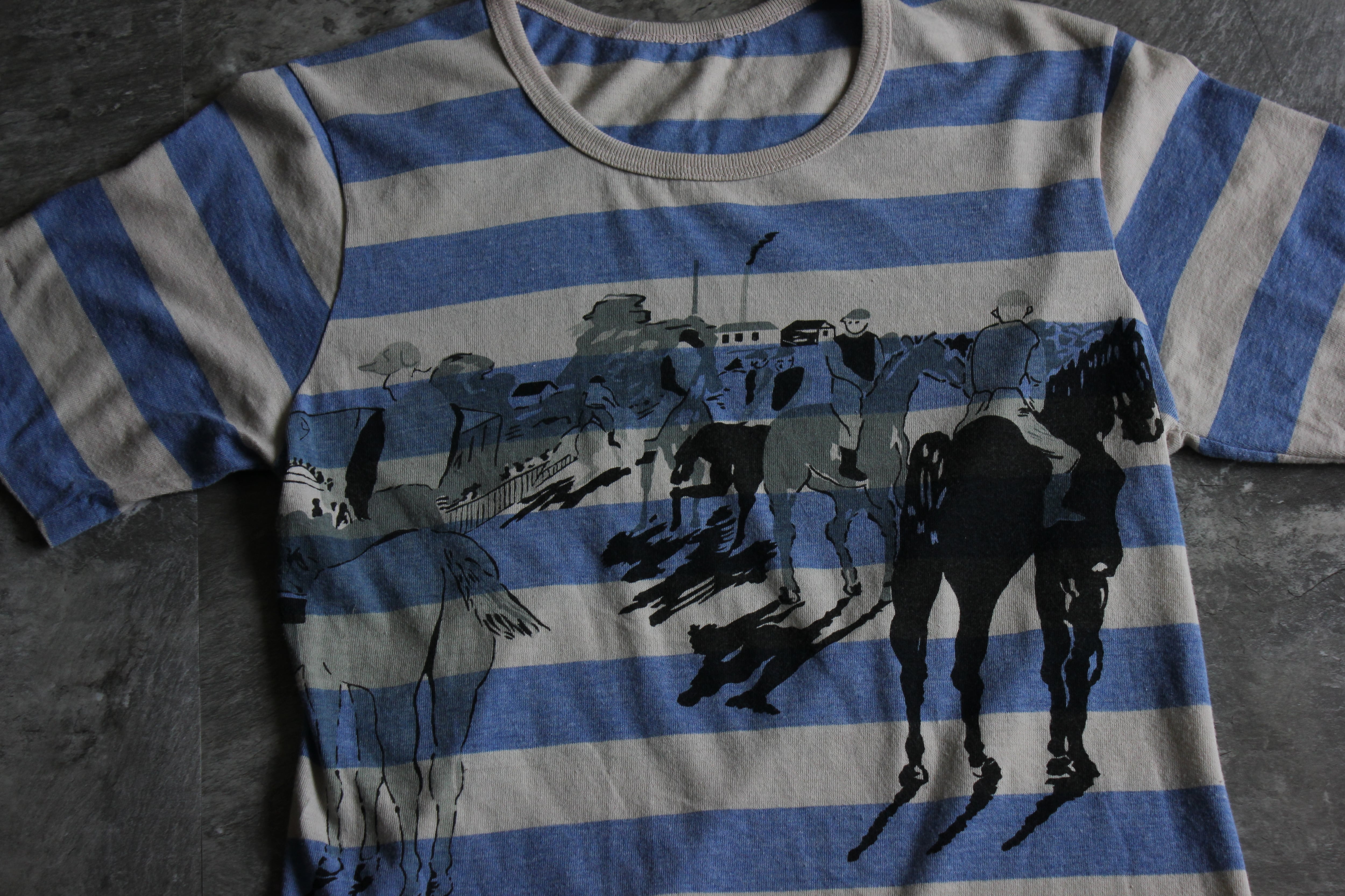 馬に乗った人々の静かな行進風景を多色刷りで表現。顔料プリントのかすれや、ラフな縫製からも当時の空気感を感じられる一枚。アートピースとしても◎