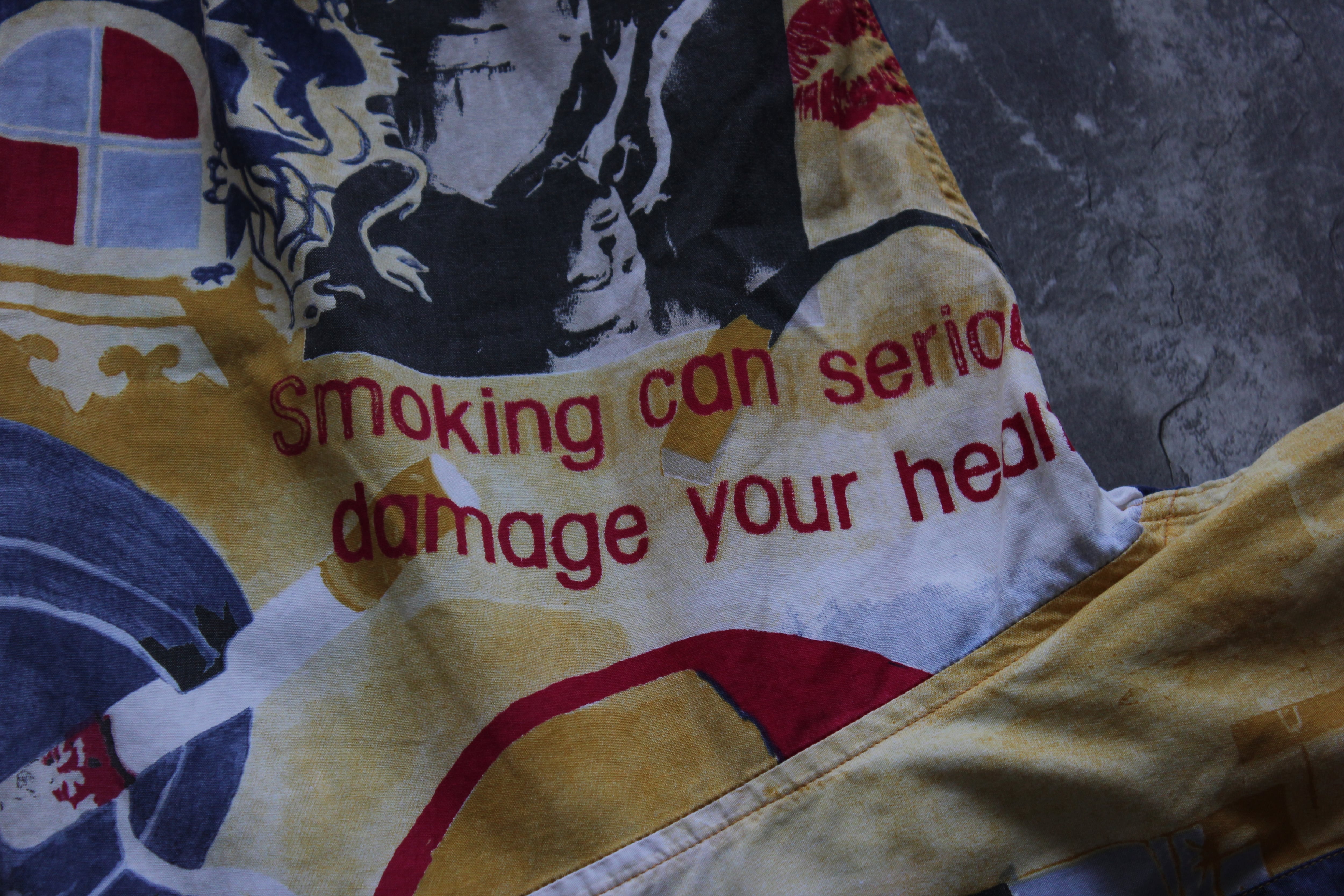 タバコ広告のパロディや社会的メッセージUNLUCKY STRIKE”、“Smoking can seriously damage your health”を散りばめた、風刺の効いたパロディ系のポップアートデザインが特徴です。