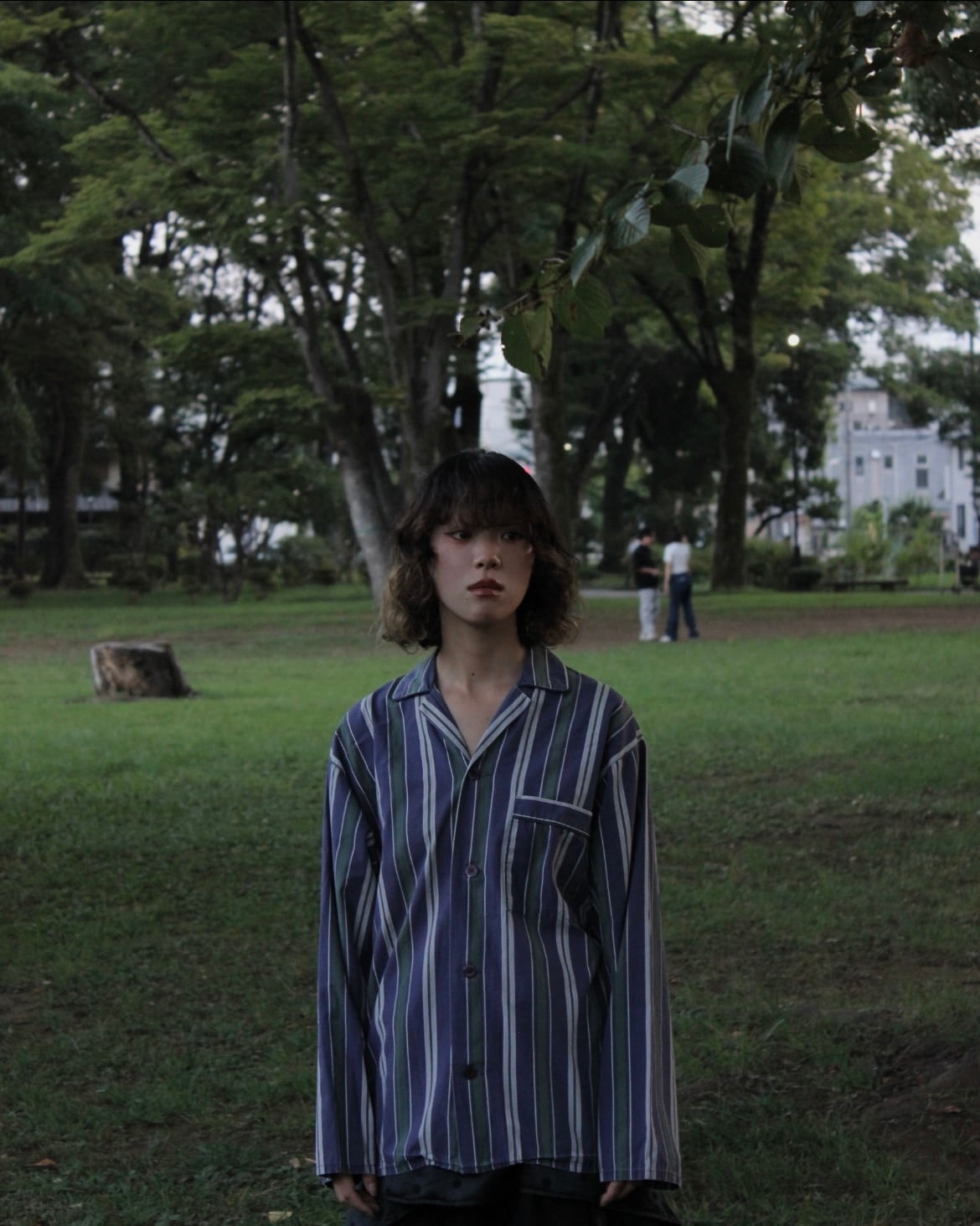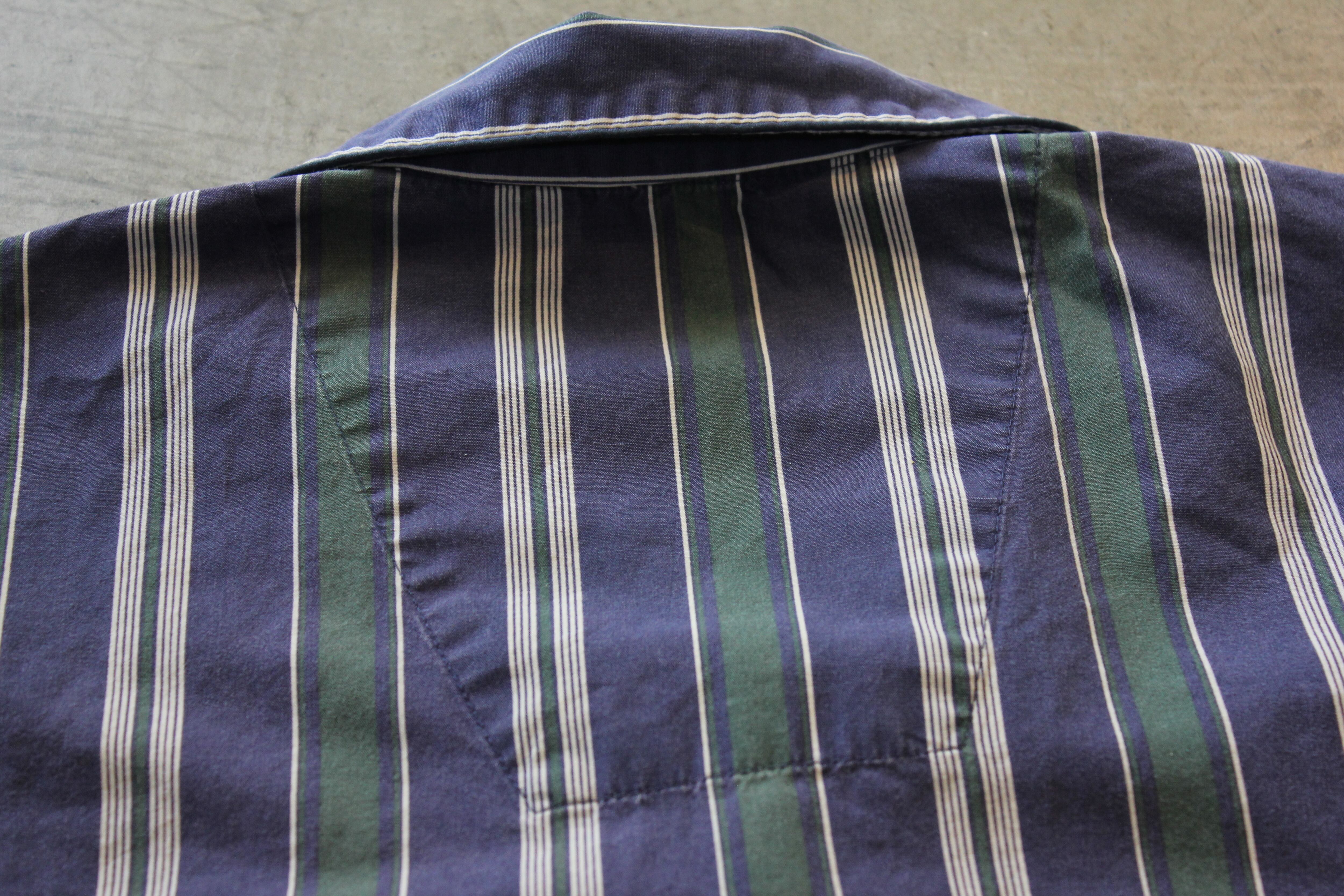 ネイビー×グリーンのブリティッシュらしいストライプ柄に、オープンカラーの身幅ゆったりシルエット。