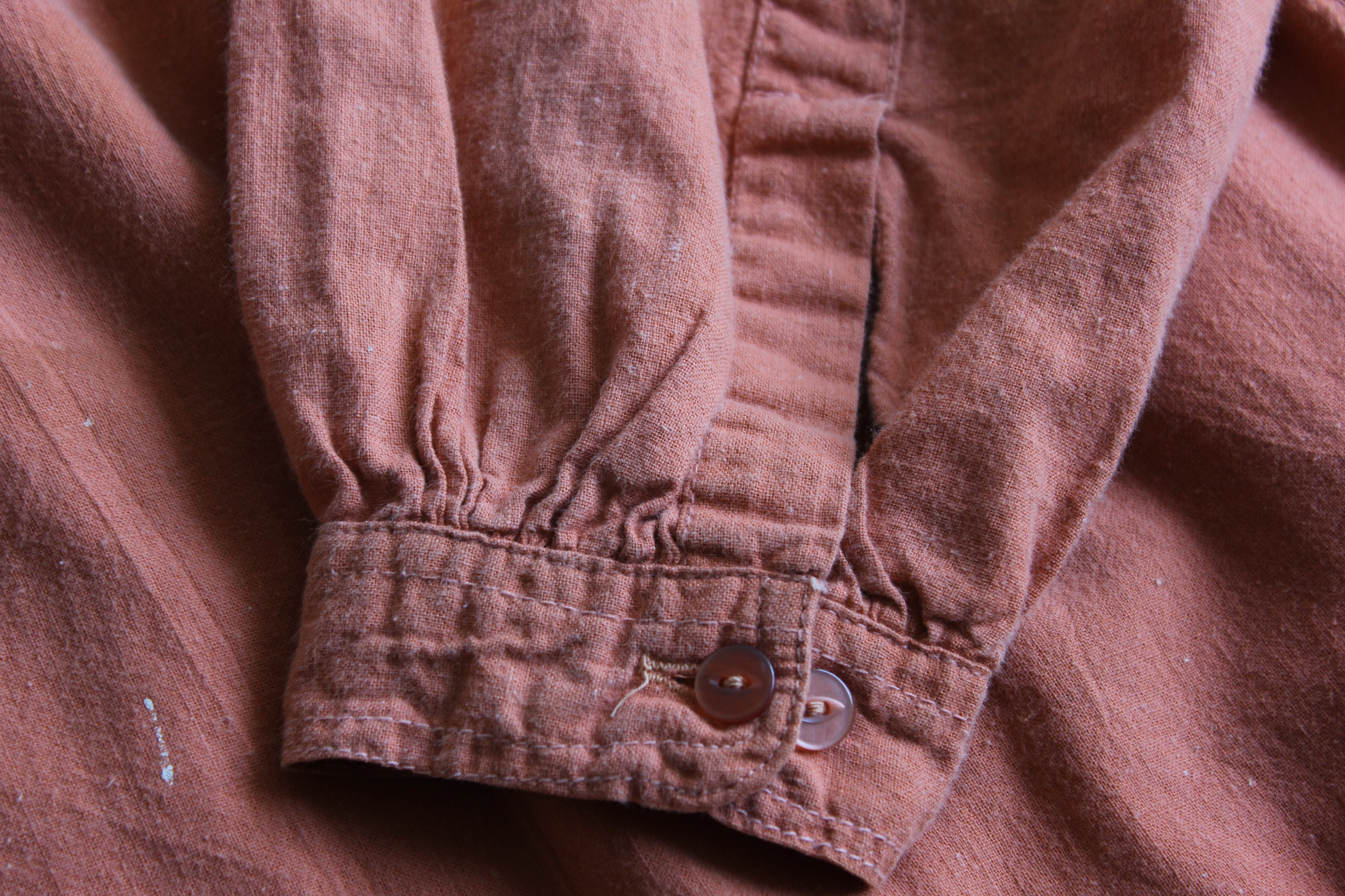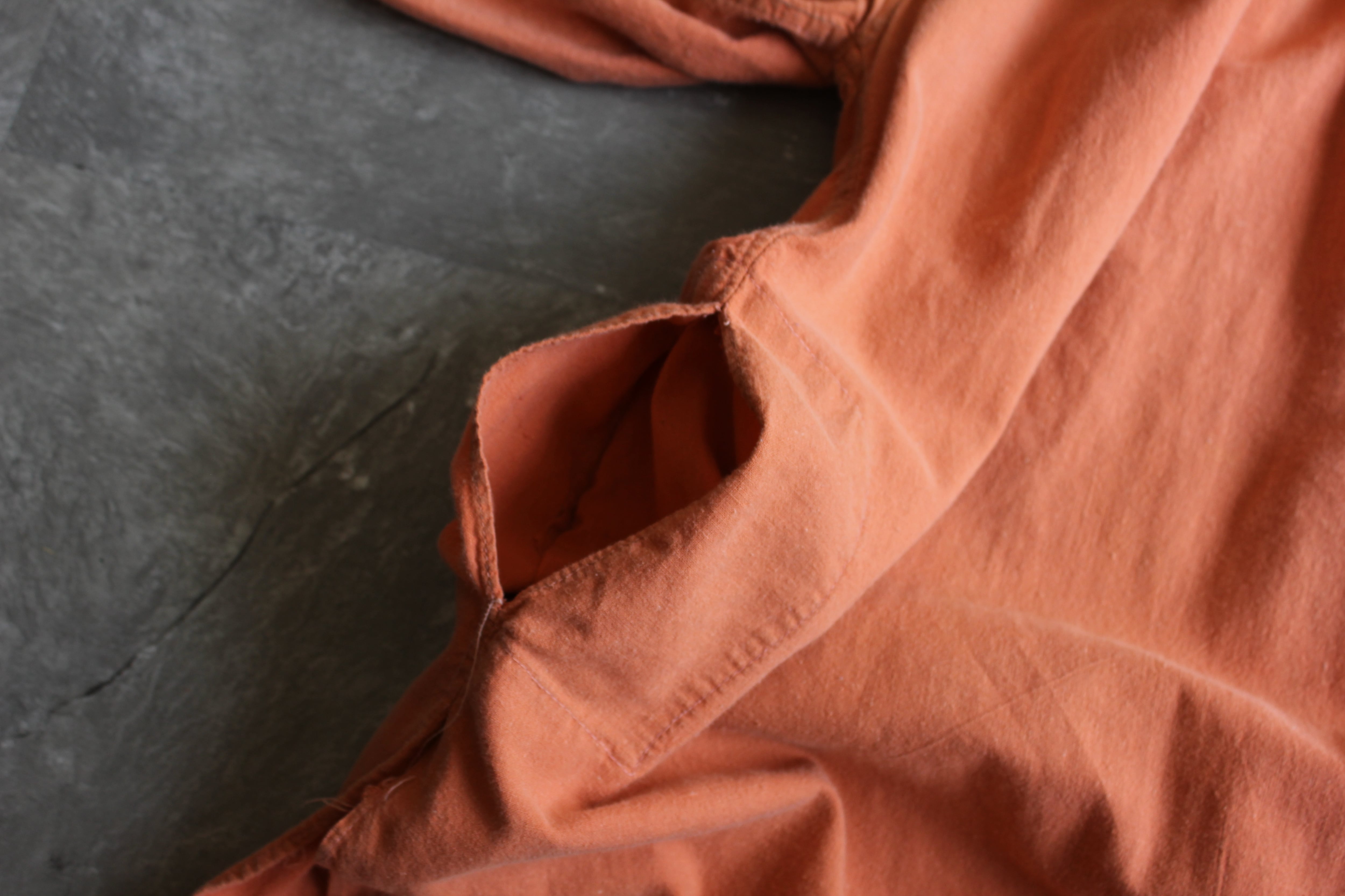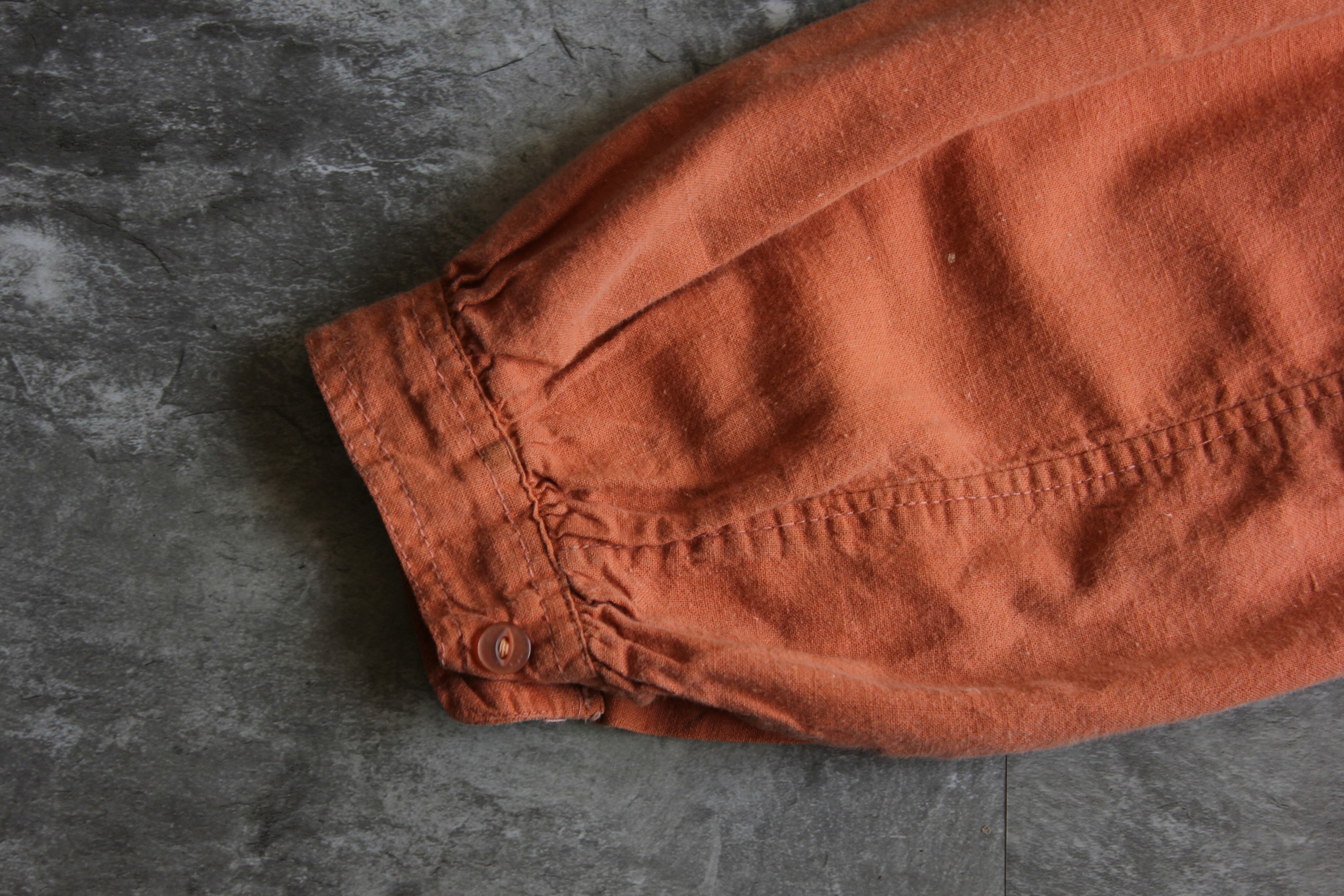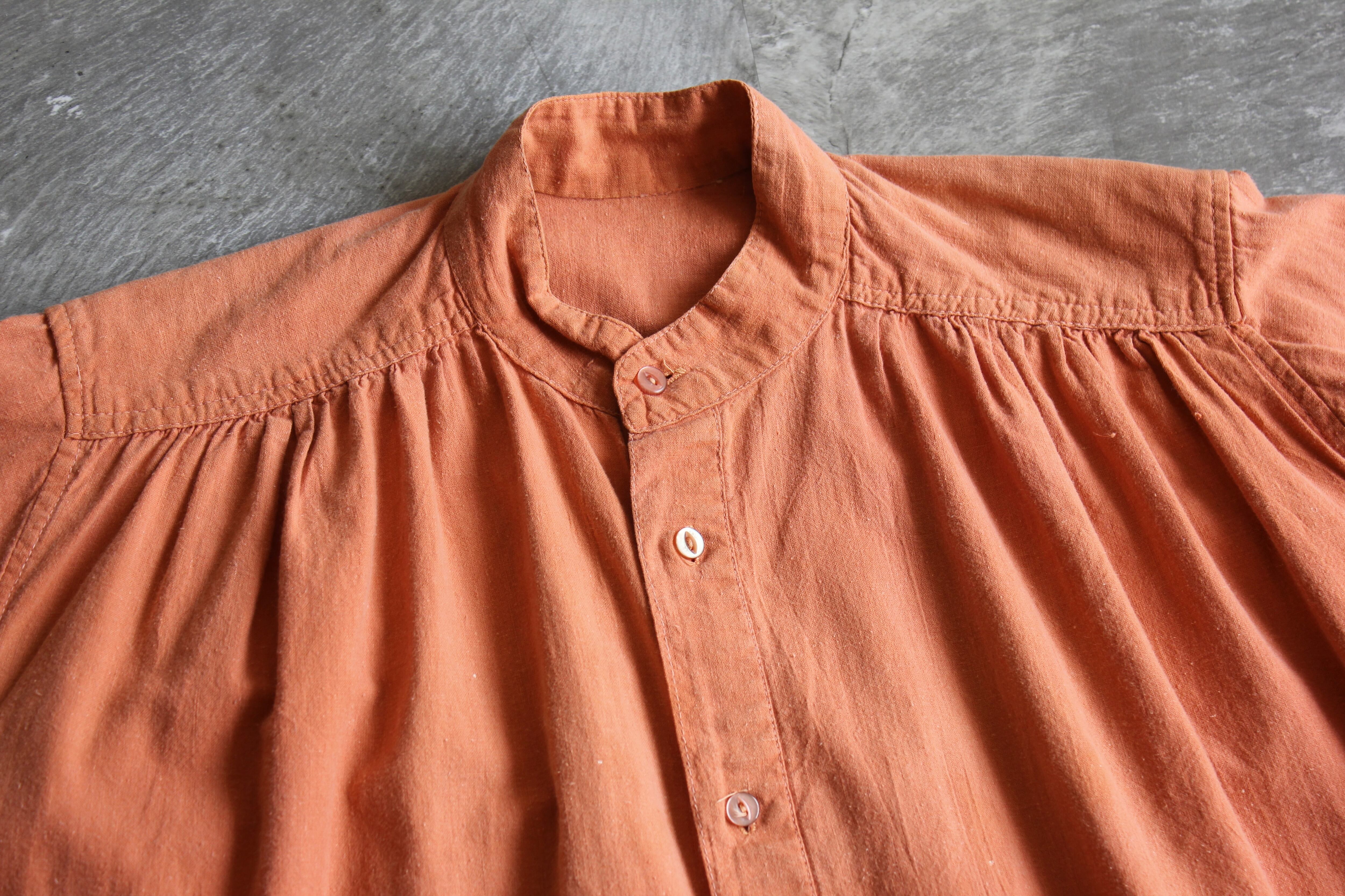 テラコッタカラーと、柔らかく風合いの増したコットン素材が特徴。細かなギャザーがクラシカルな雰囲気を引き立てています。
