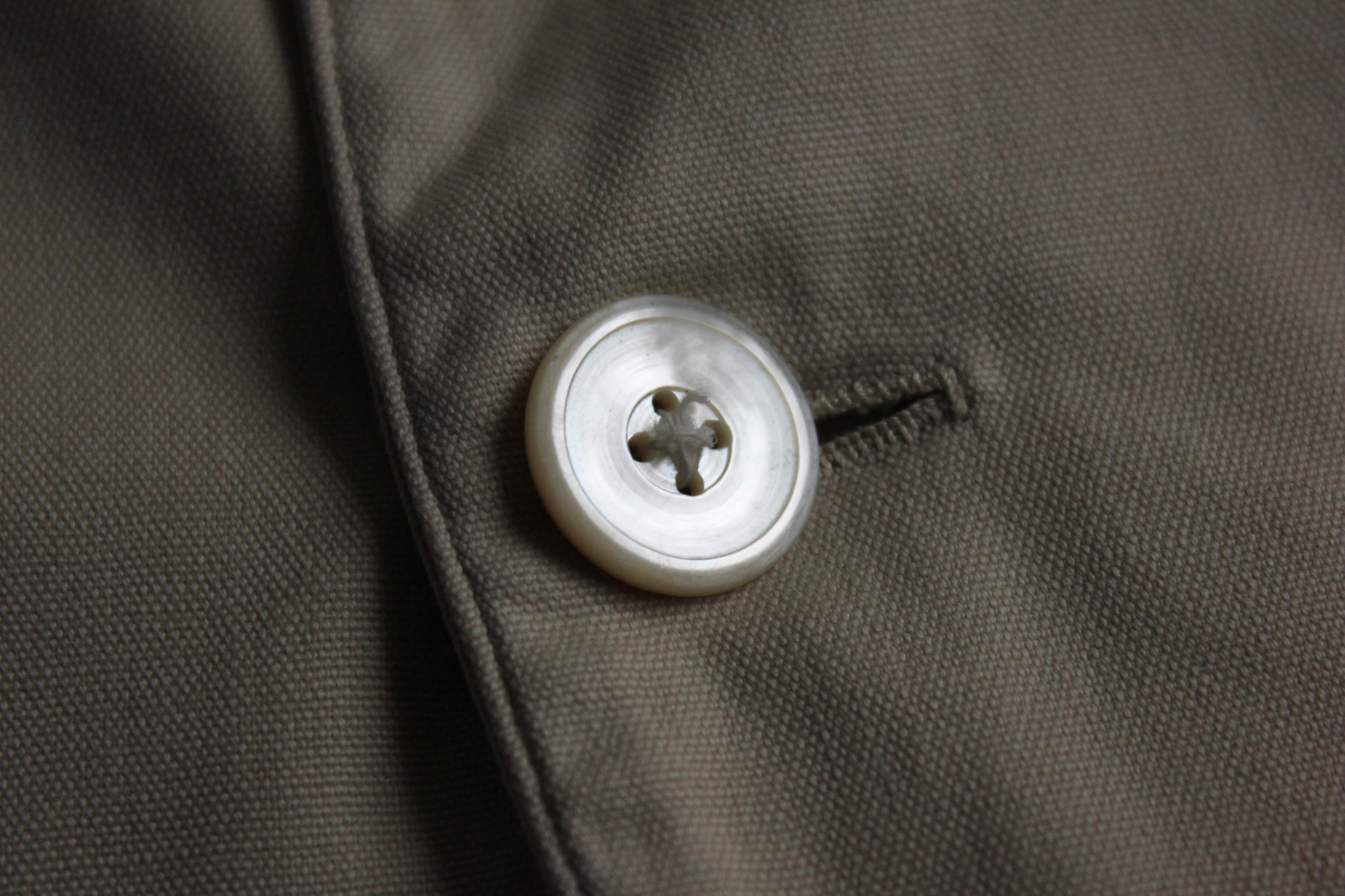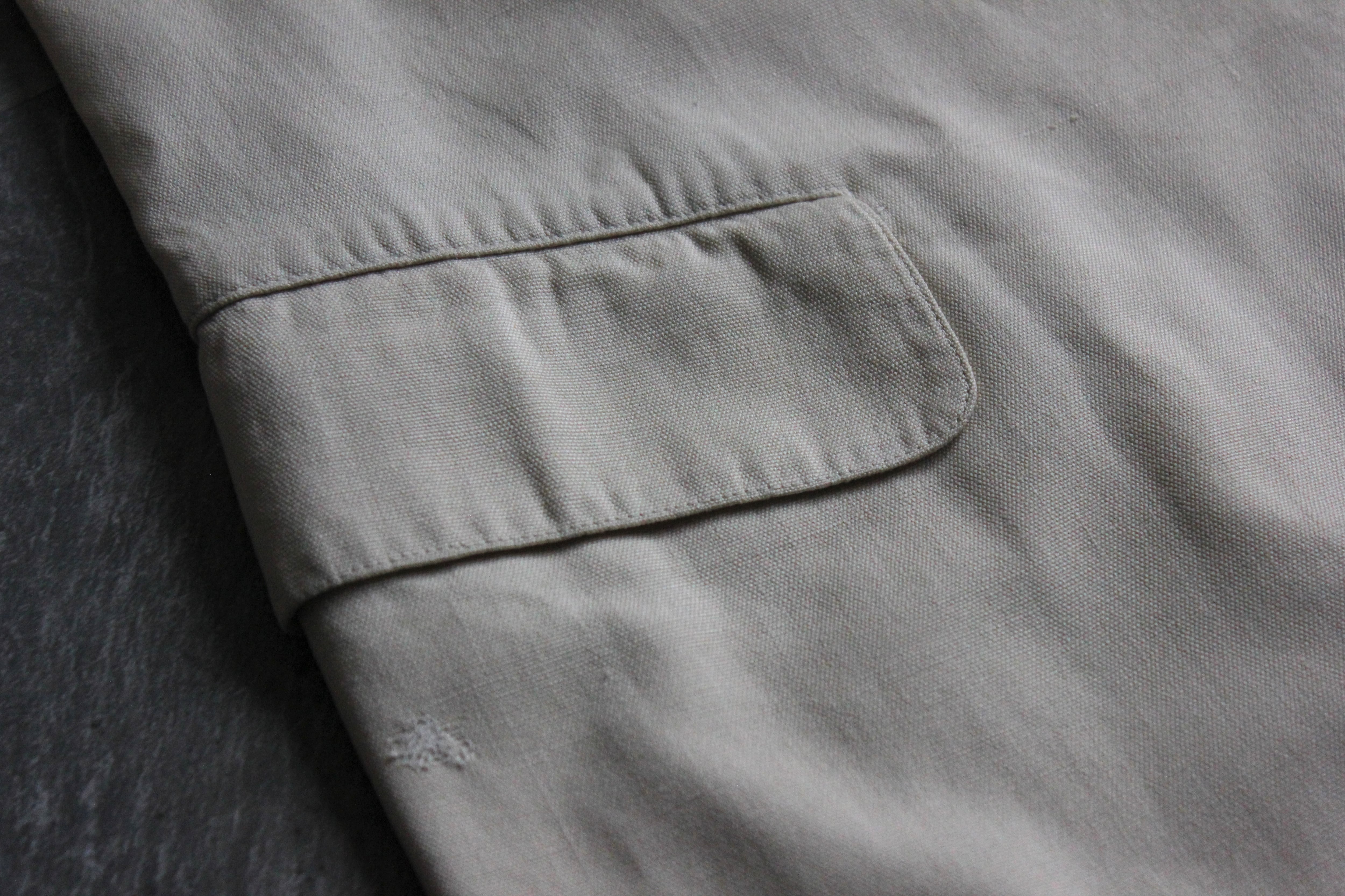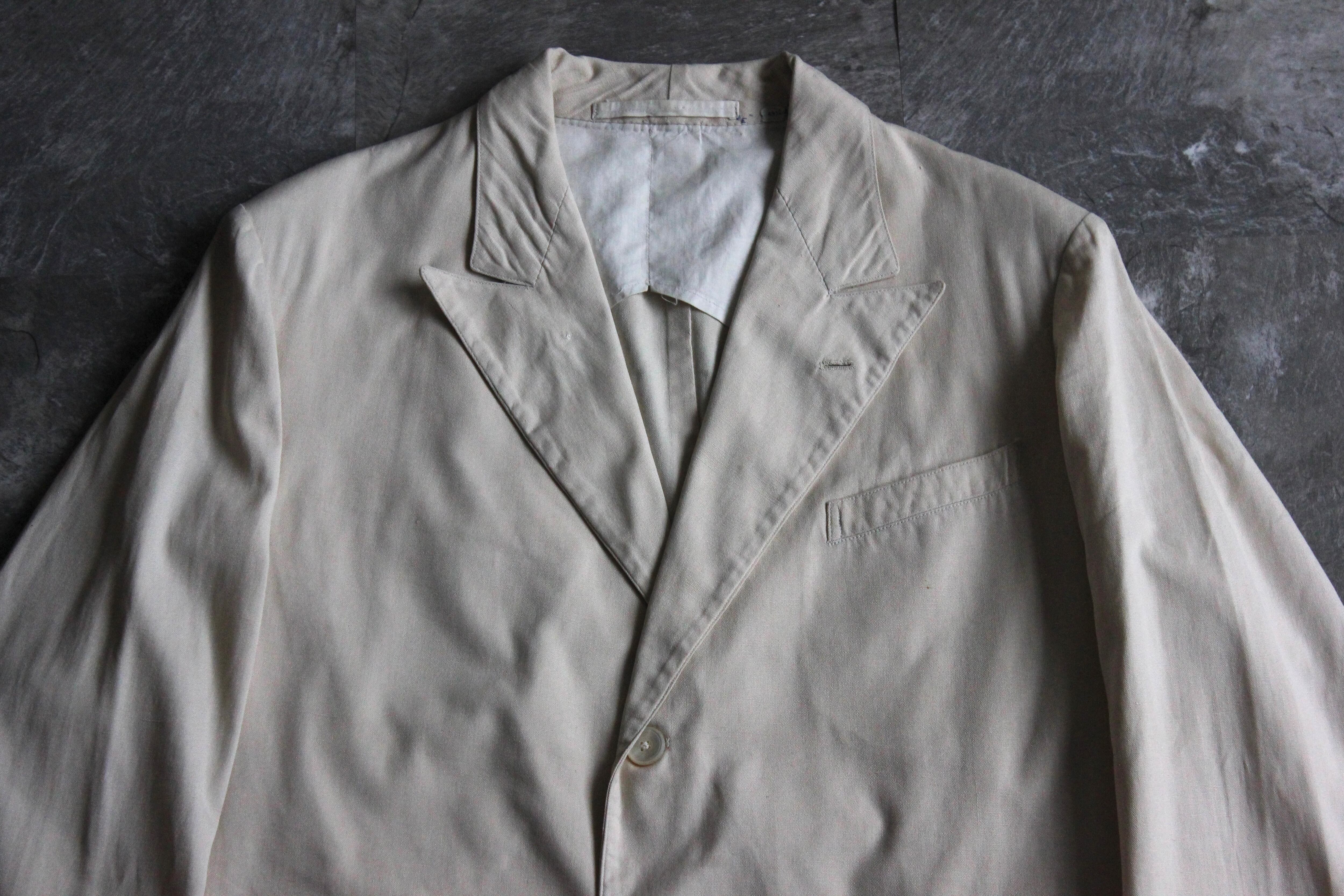 生地は生成りがかったベージュのコットンキャンバス。ワークの無骨さとテーラードの上品さを併せ持つ質感で、現代のスタイリングにも落とし込みやすいかと。