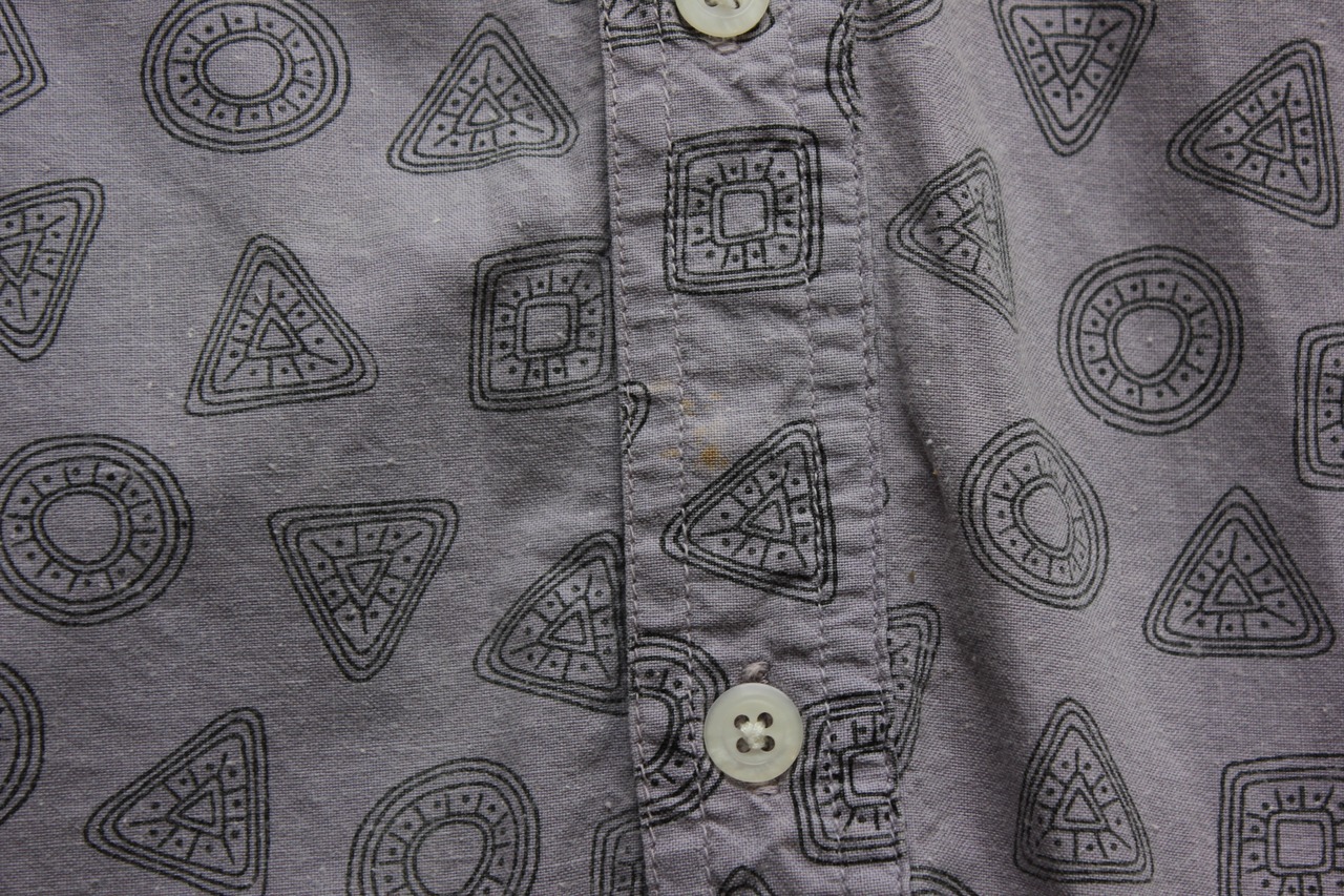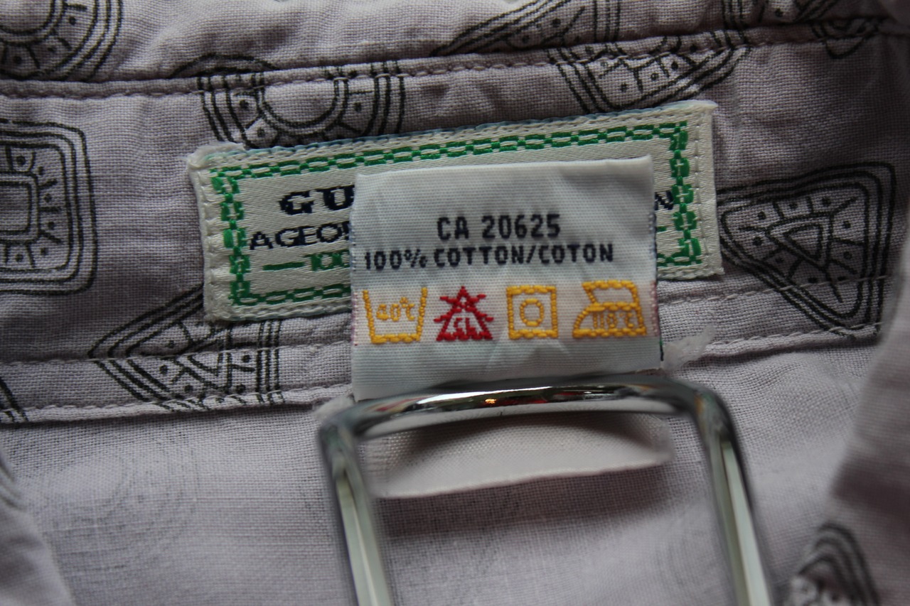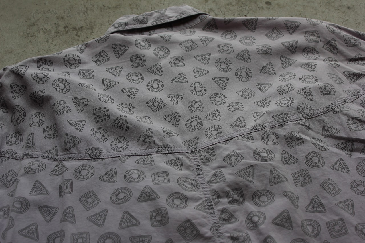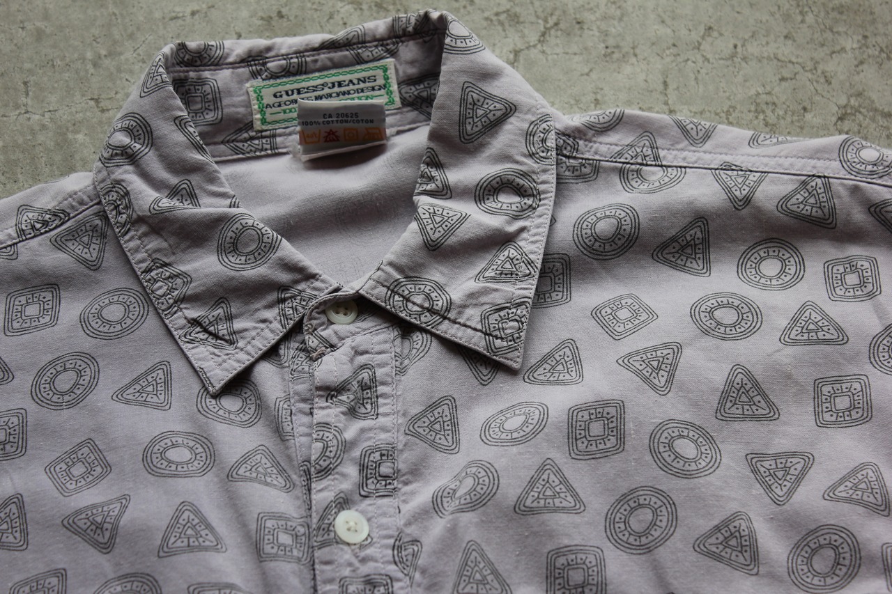 幾何学モチーフの総柄とフィッシングシャツ構造が融合した、Georges Marciano期のレアピース。