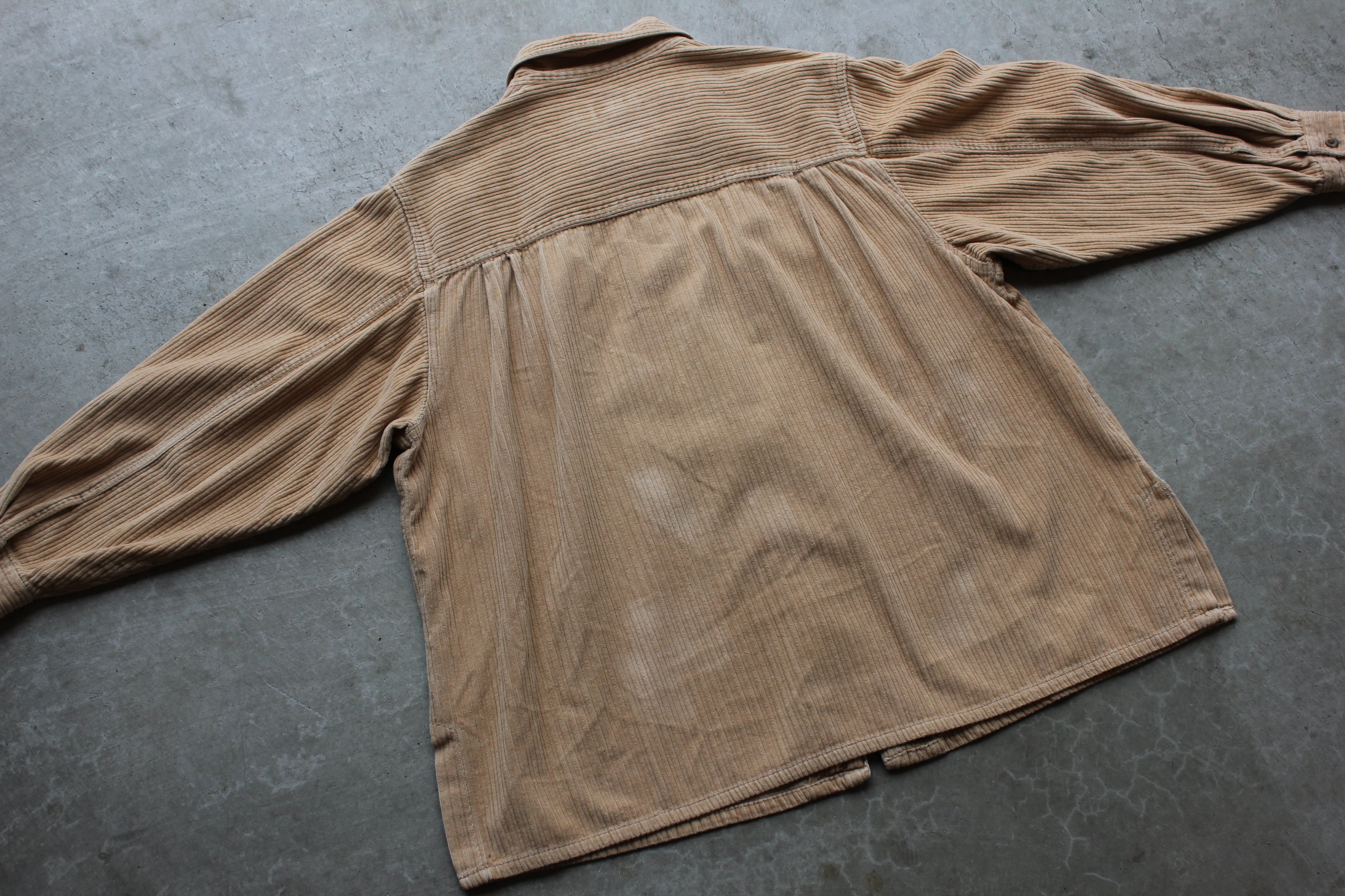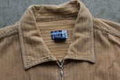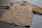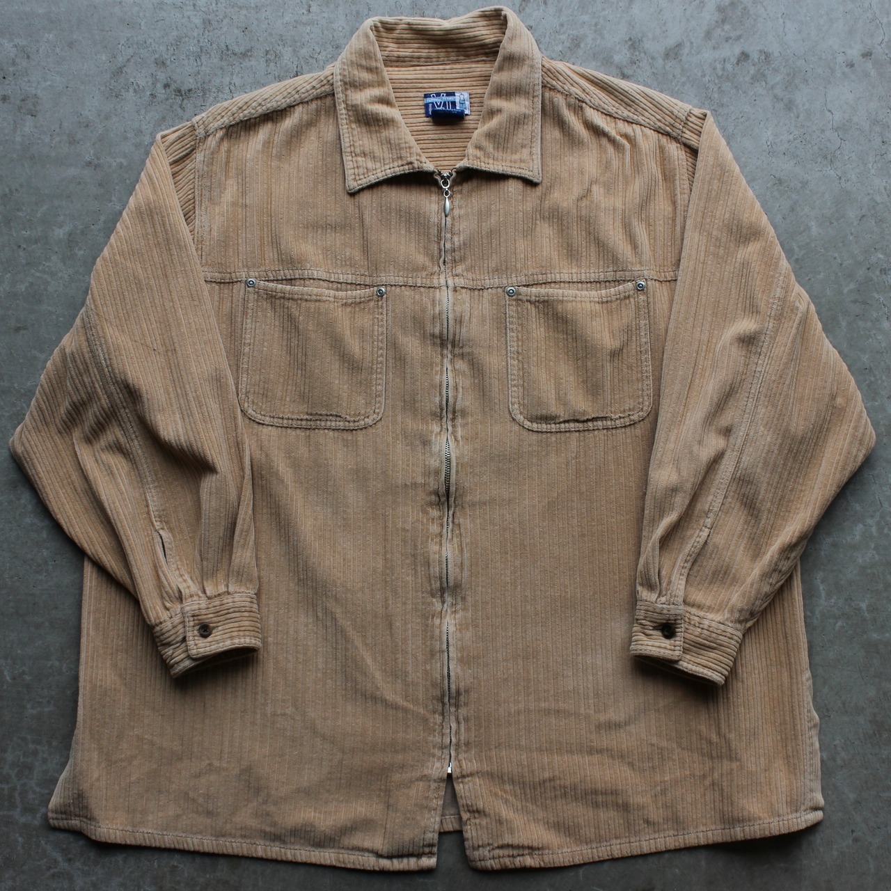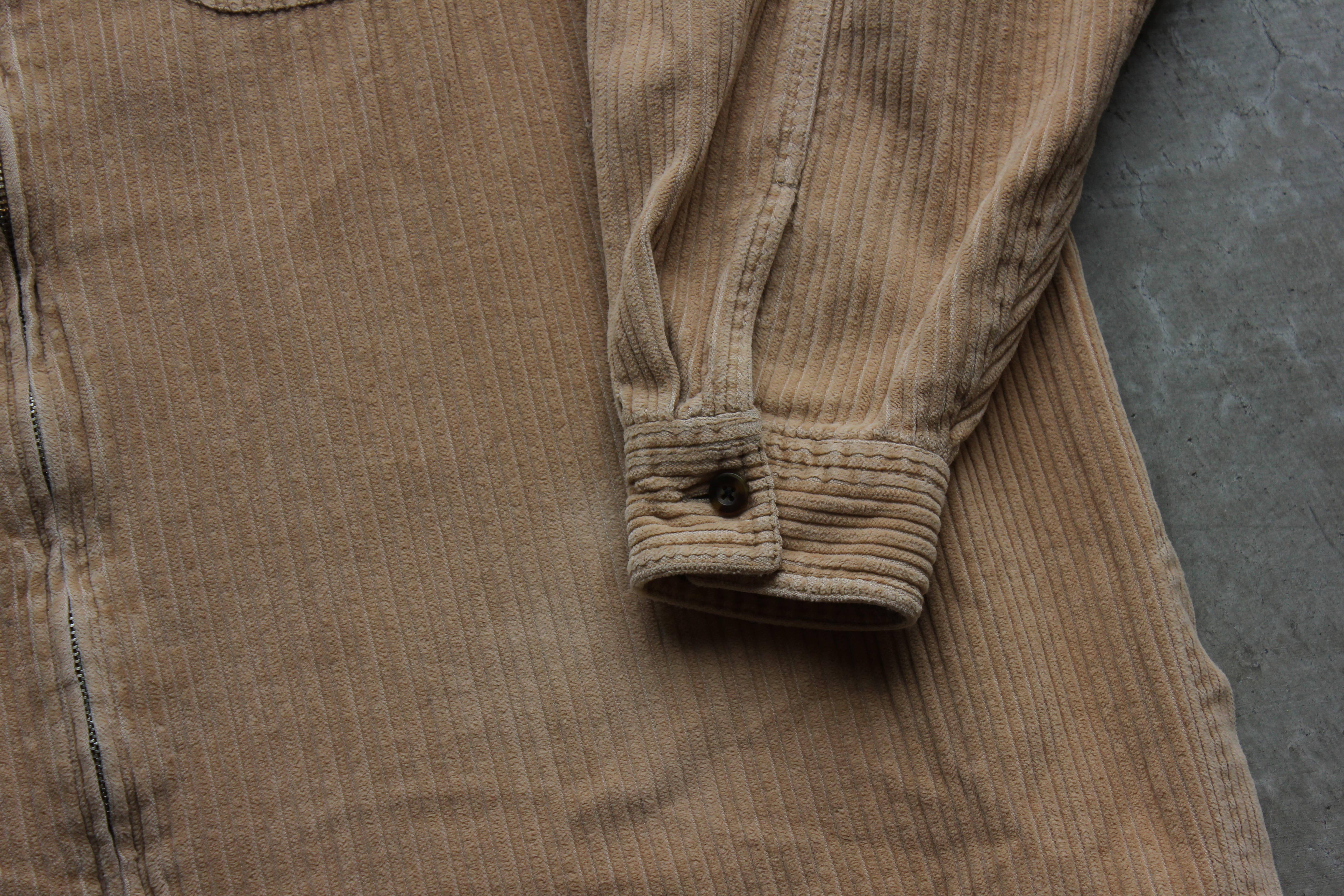 柔らかなサンドベージュカラーのコーデュロイシャツ。ボタンではなくジッパーなので都会的なスタイルに。