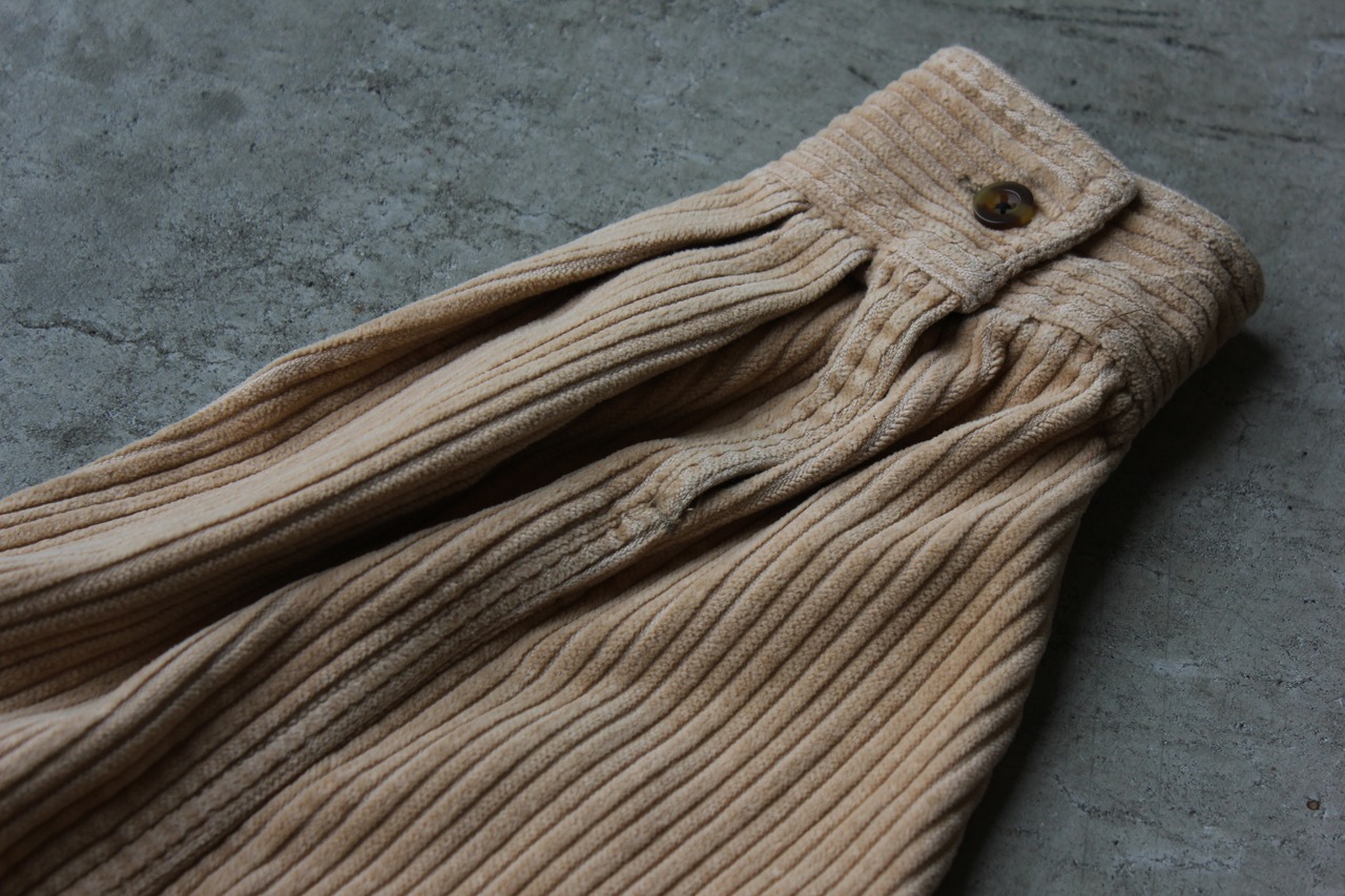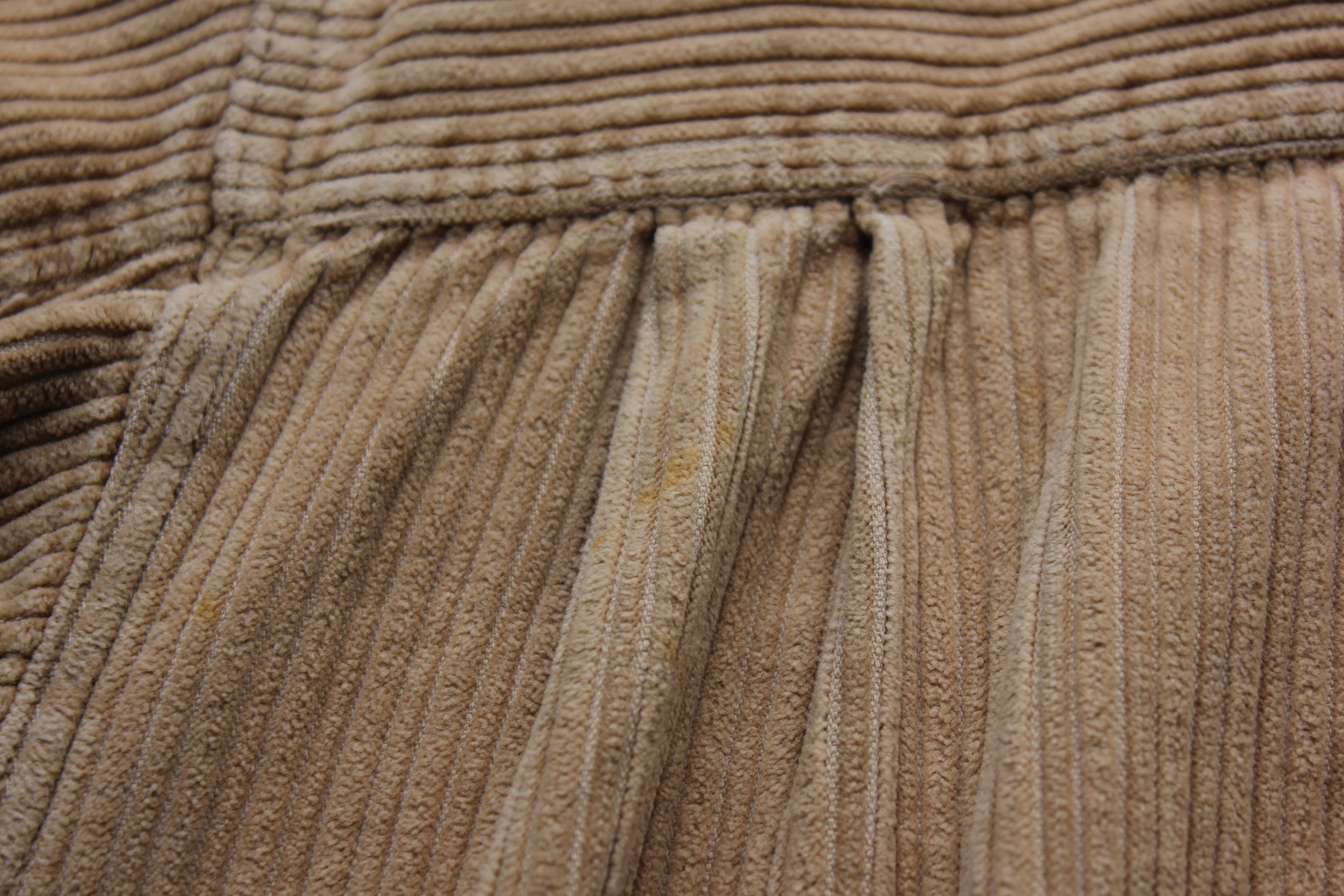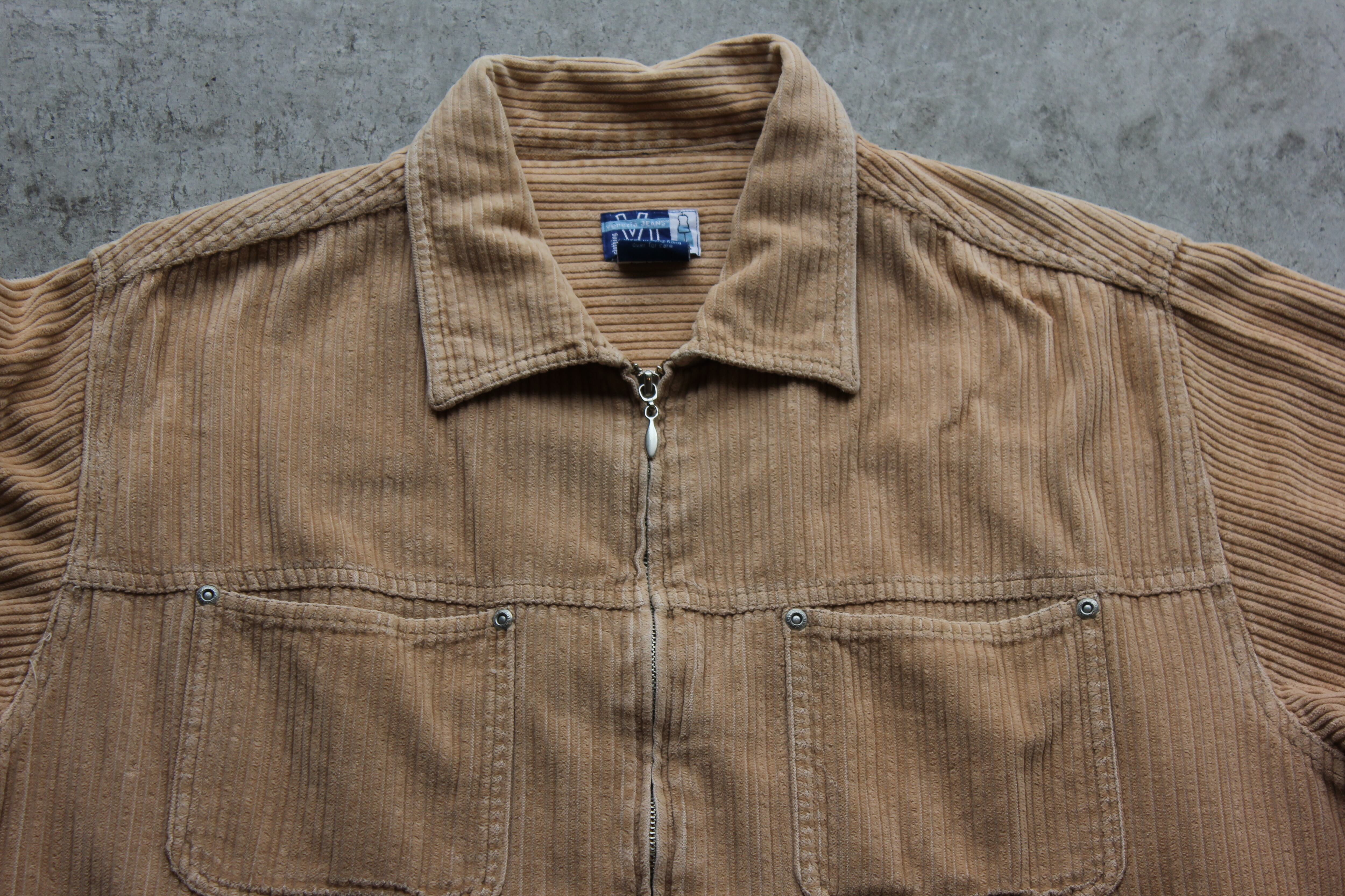 柔らかなサンドベージュカラーのコーデュロイシャツ。ボタンではなくジッパーなので都会的なスタイルに。