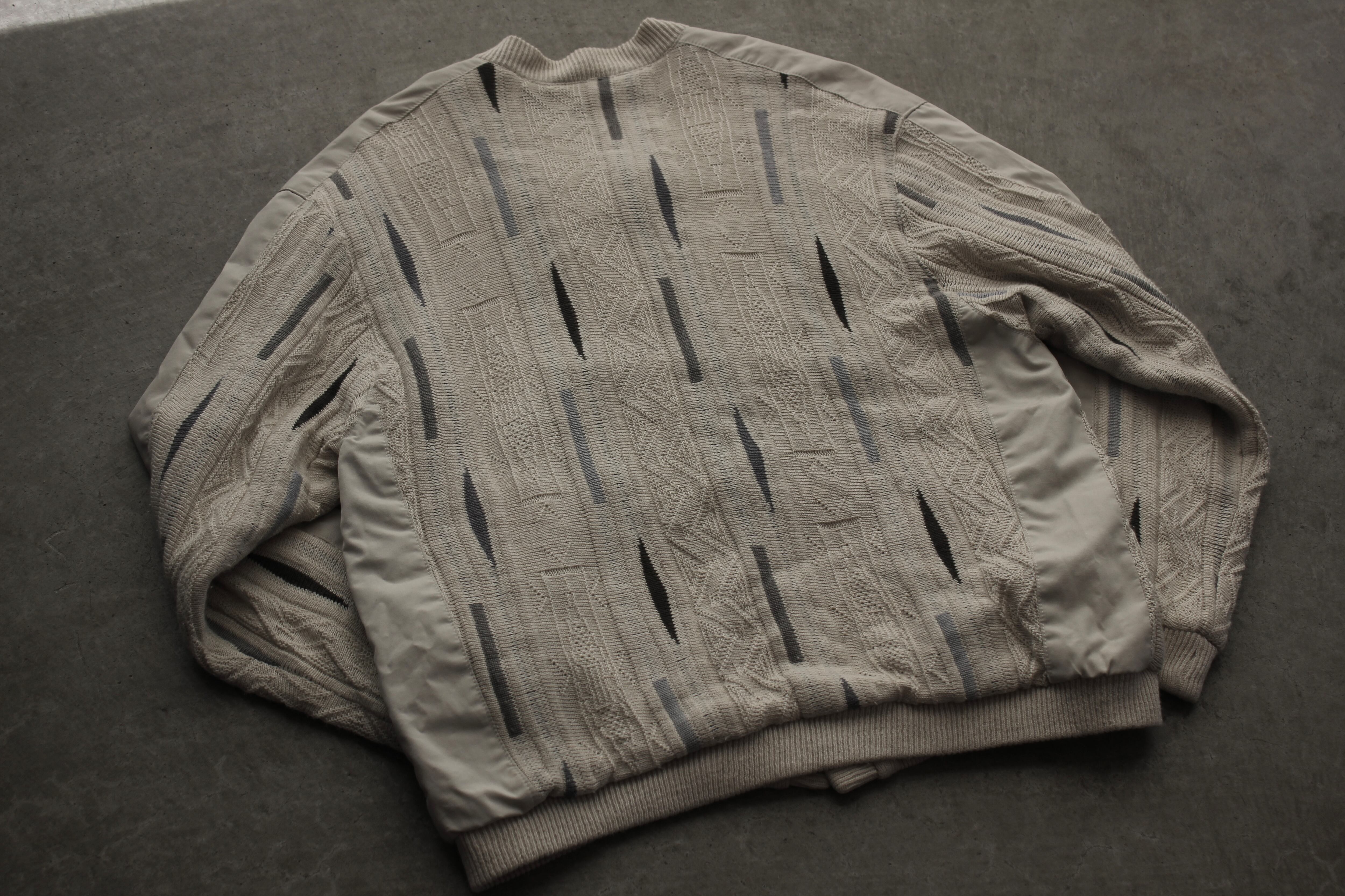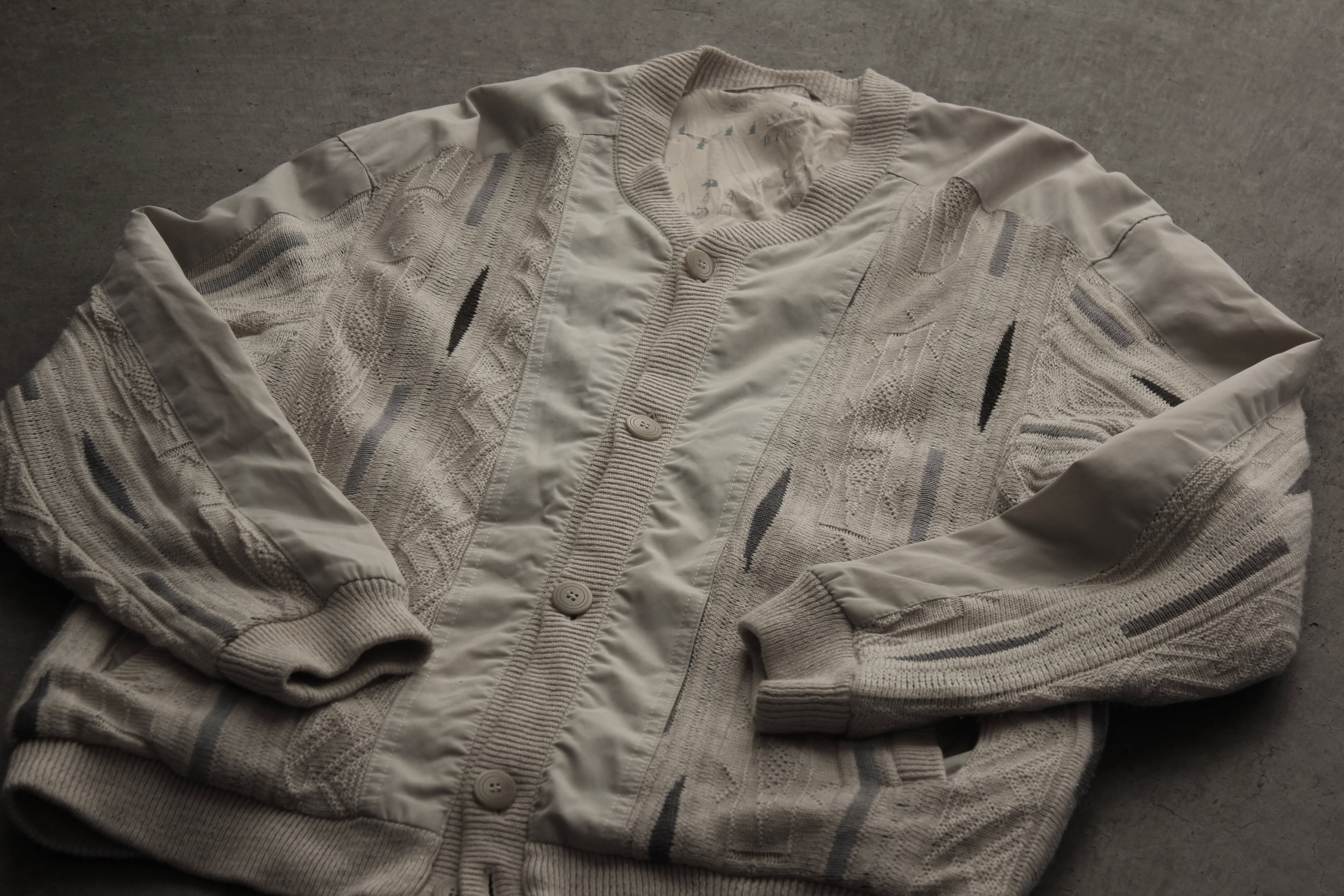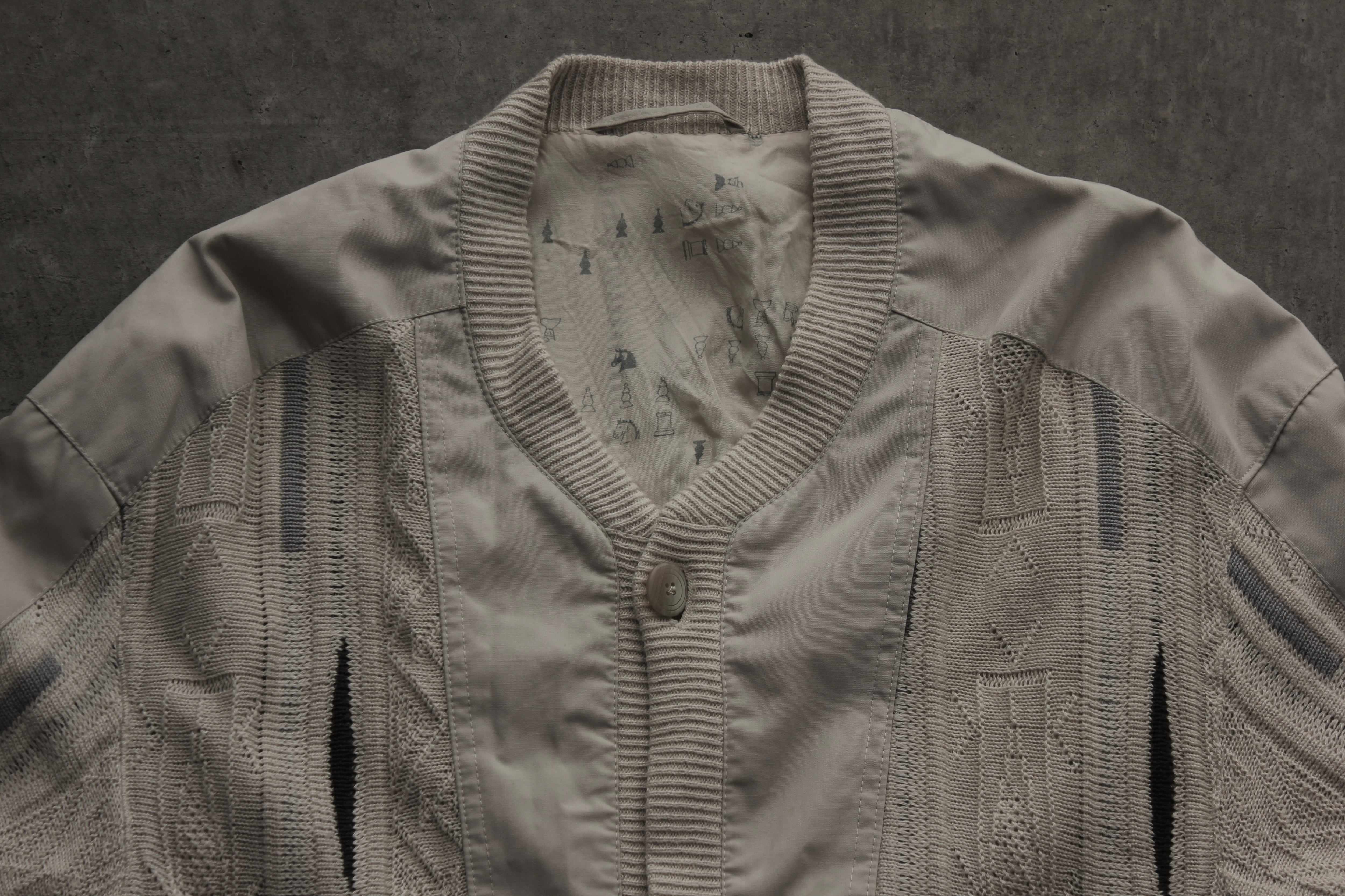 前身頃、背面、袖に立体的な幾何学模様のニットパネルを配し、肩やフロントを滑らかなナイロンで切り替えたデザイン。