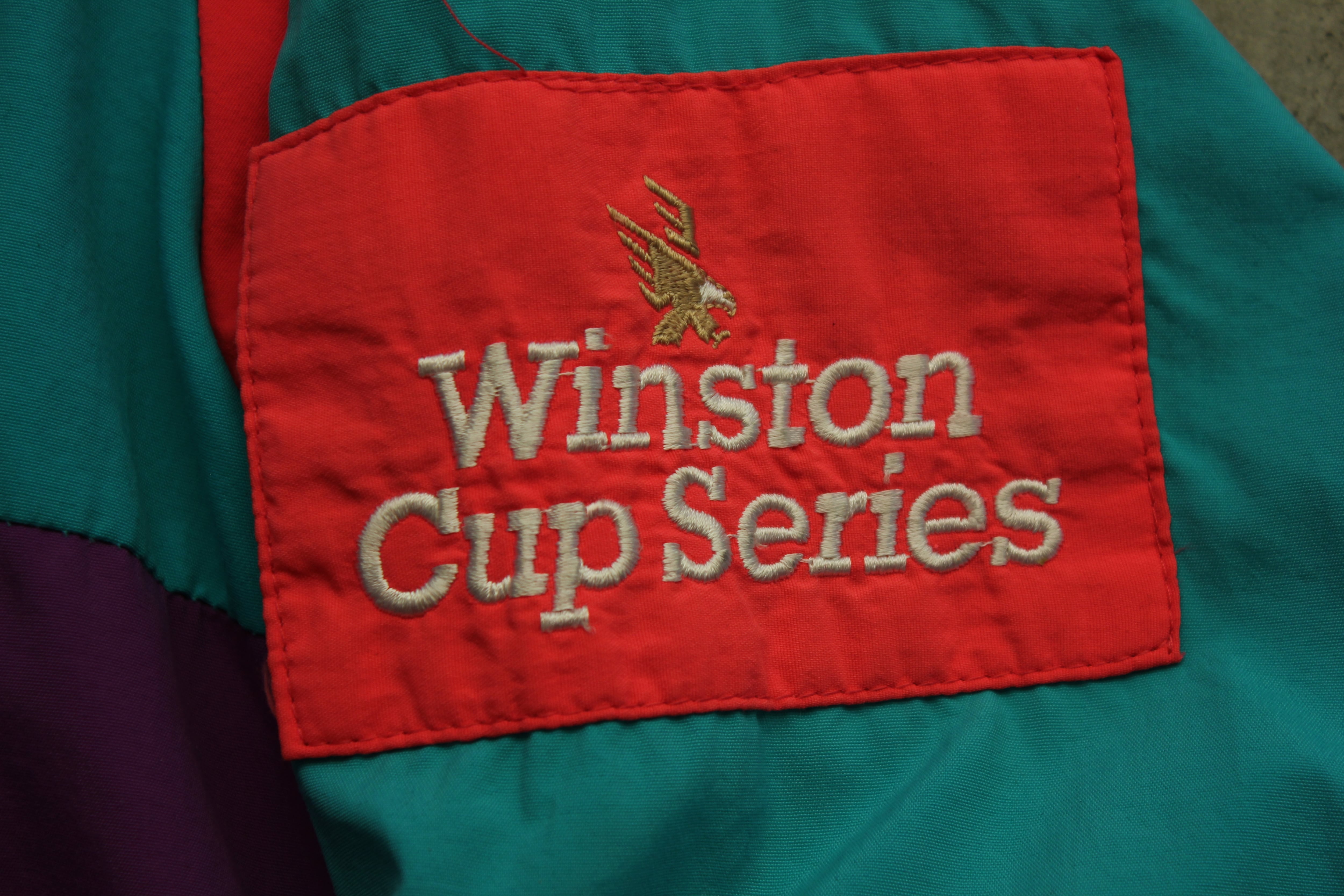 袖にWinston Cup Series刺繍パッチ、背面にMOTORSPORTSワッペン入りのオフィシャル仕様。