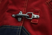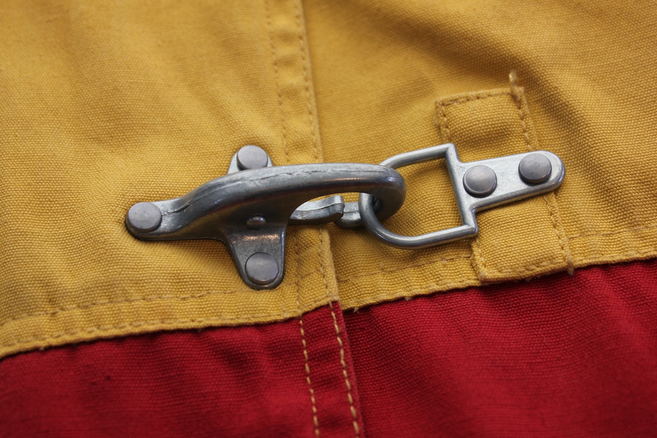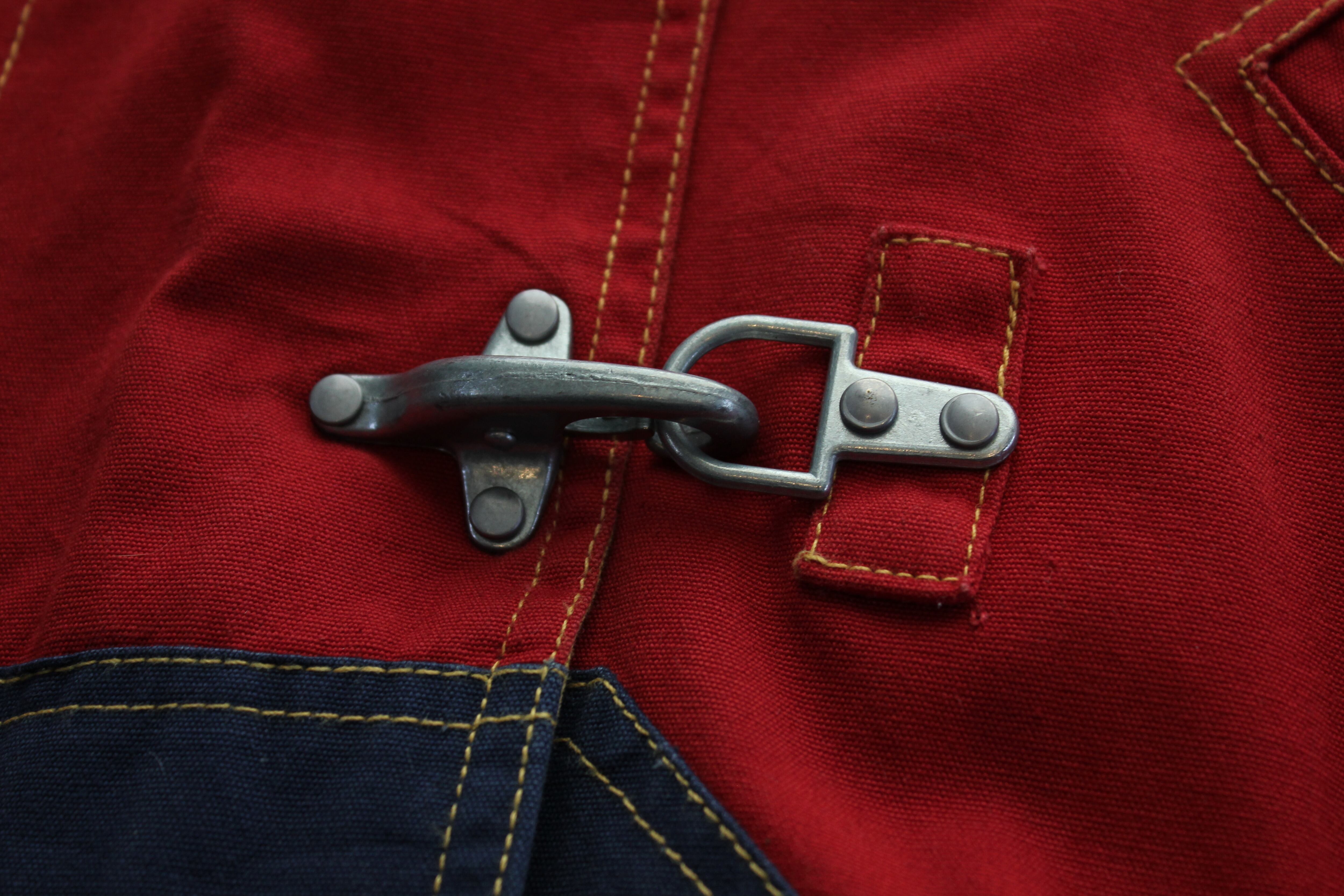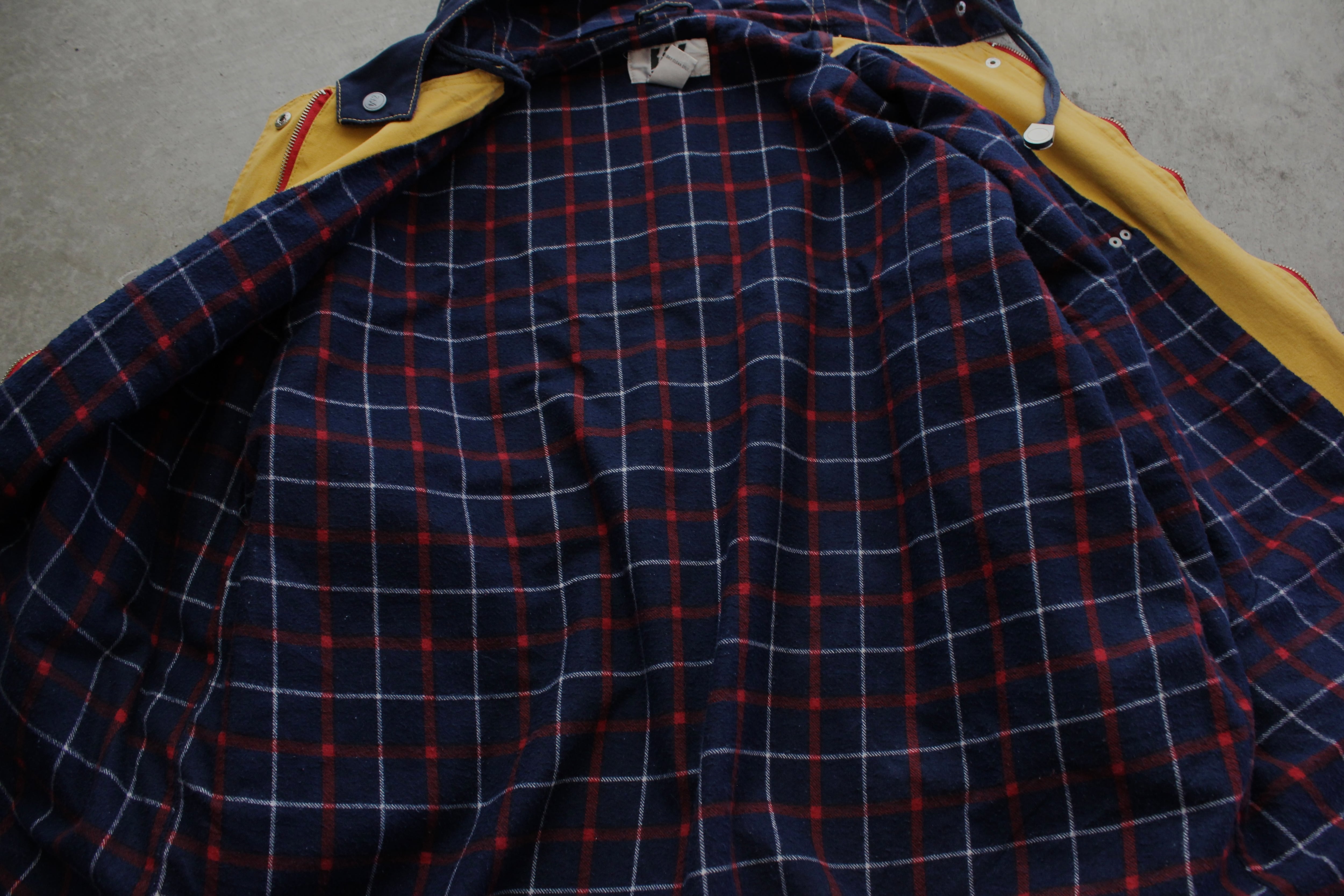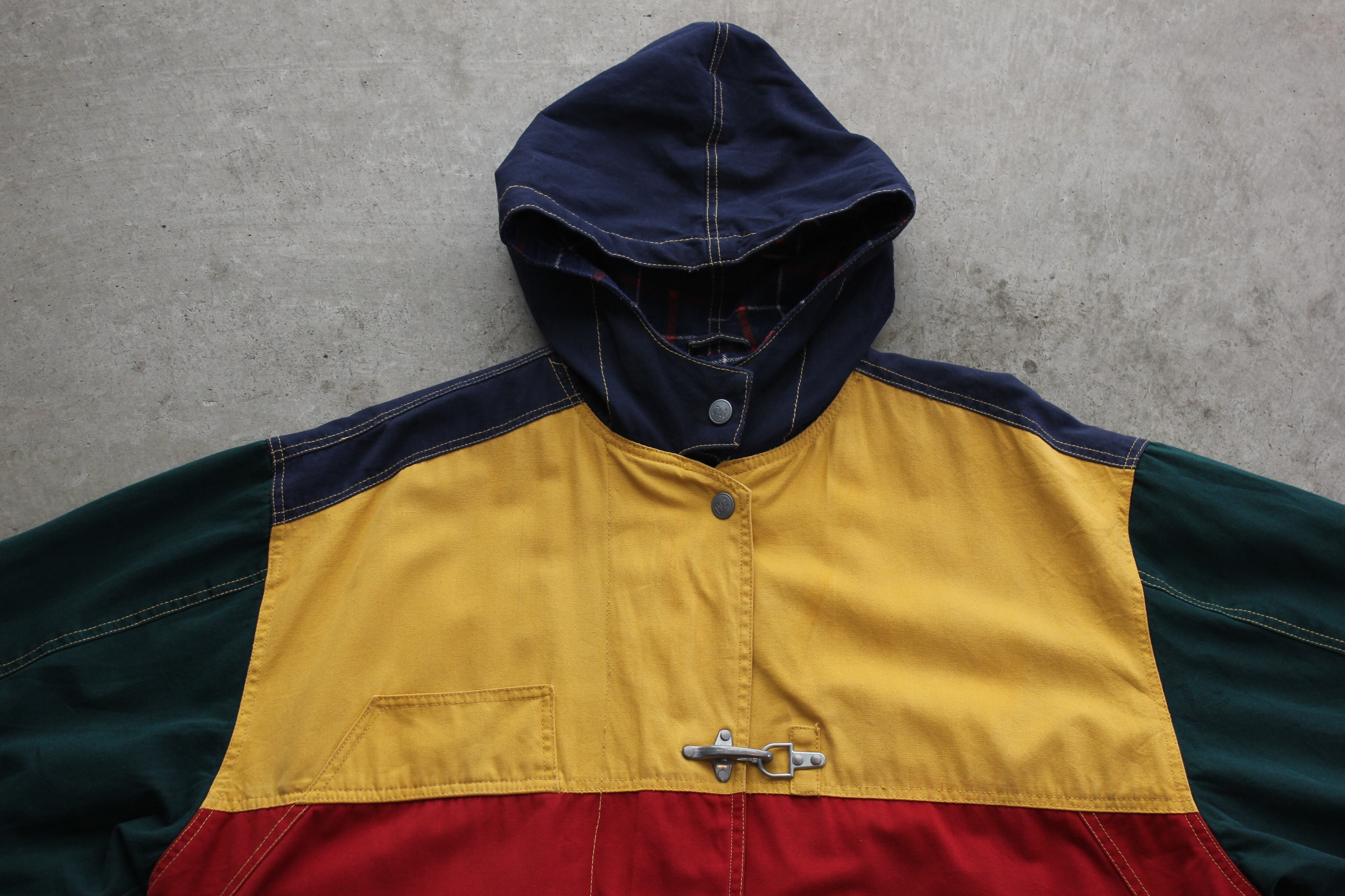 金具トグル仕様と、マスタード・レッド・ネイビー・グリーンを組み合わせた大胆なカラーブロックデザインが特徴の一着です。