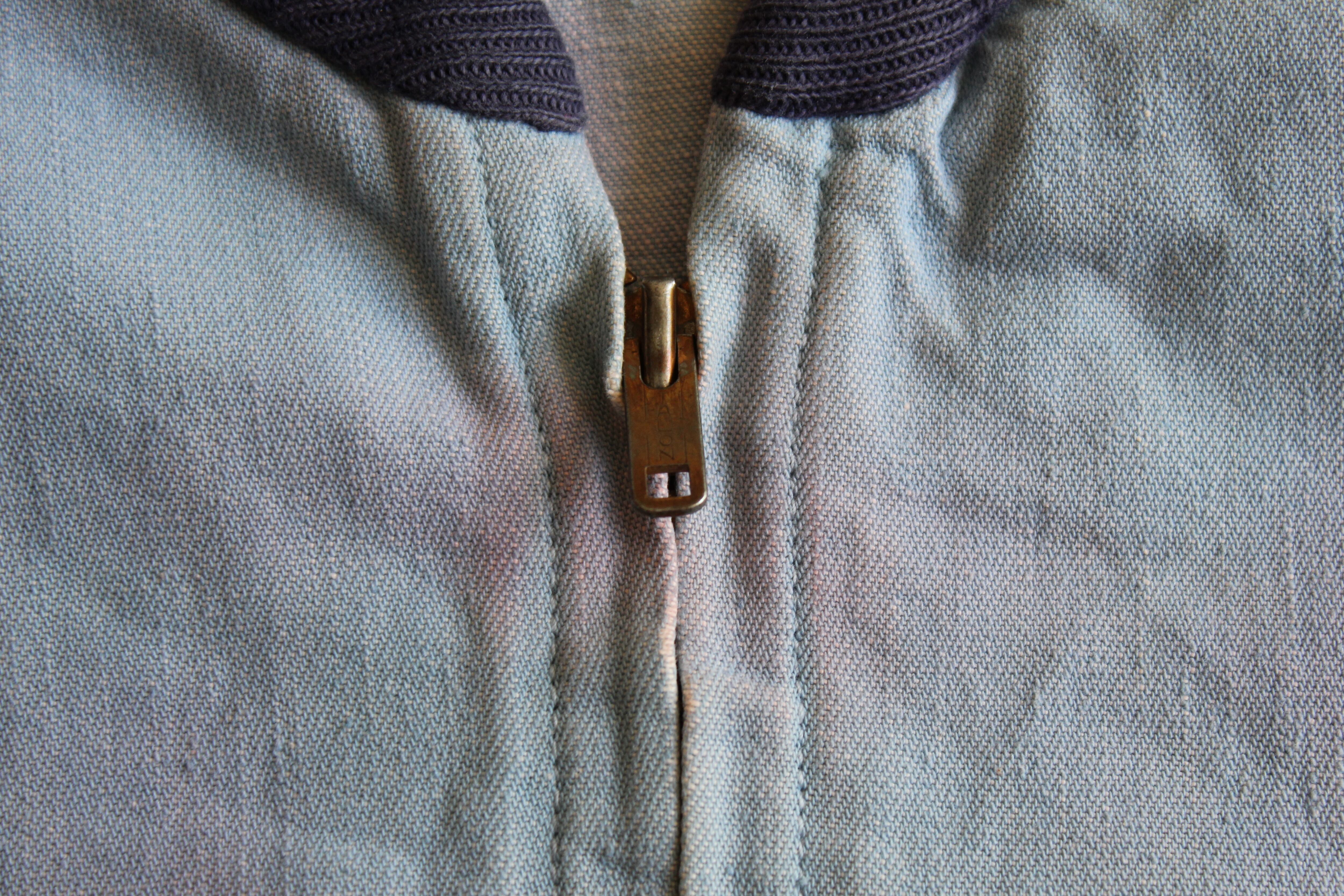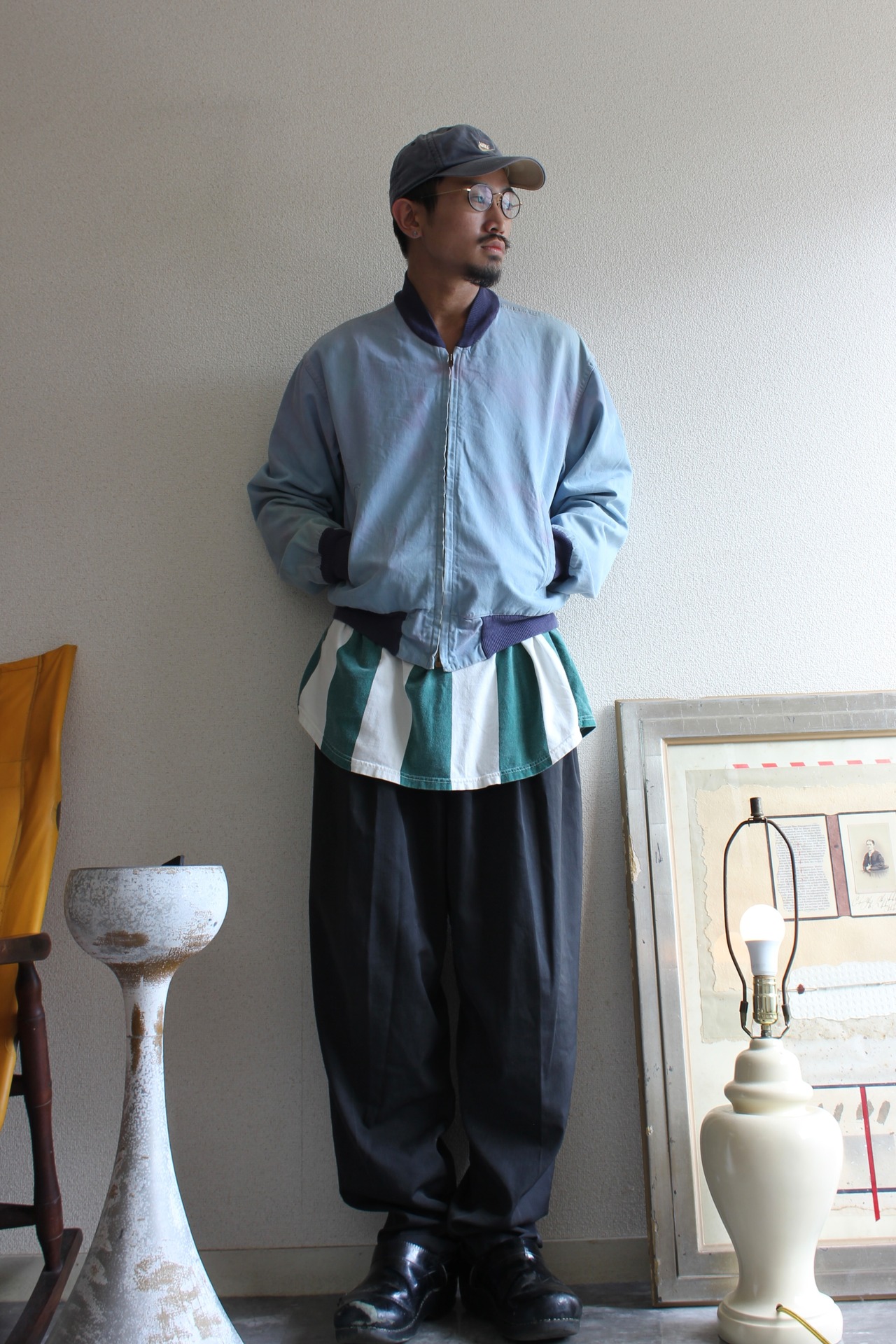 シャンブレーの優しいサックスブルーとネイビーのコントラストが良いメリハリを出してます。